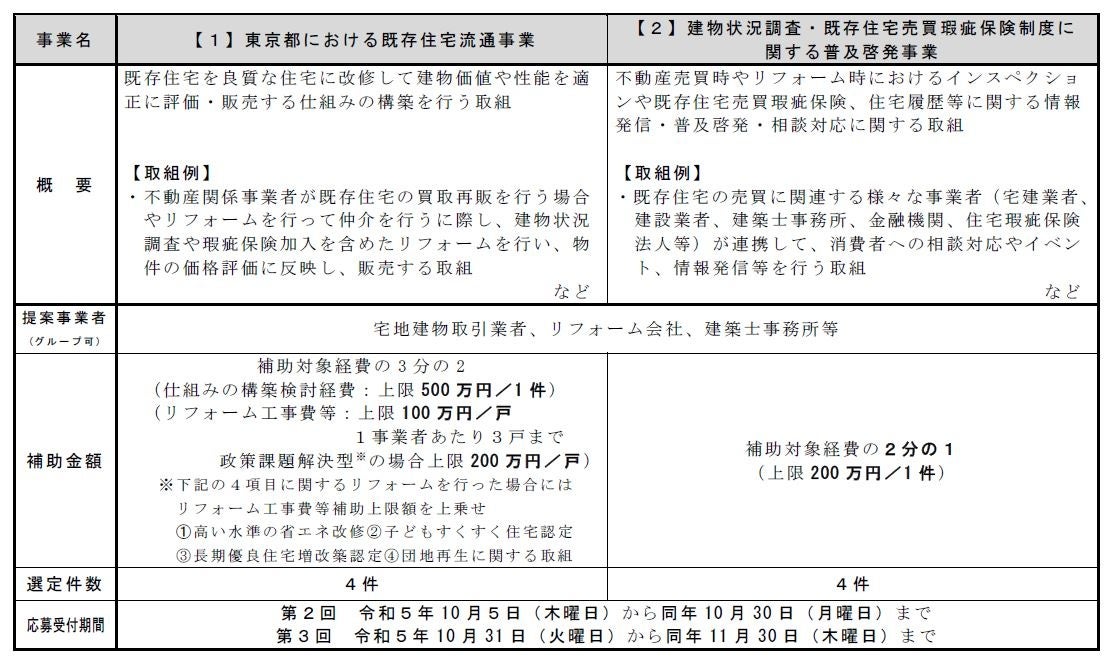 都では、令和5年度から、既存住宅を良質な住宅に改修して適正な評価の下で流通させる取組や、建物状況調査や既存住宅売買瑕疵保険制度等の普及の取組を行う民間事業者等を支援する事業を実施しており、本年度の第2回及び第3回の事業者募集を下記の通り行いますのでお知らせ致します。