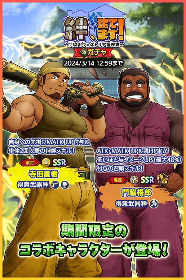 さらに、SSR魂友「寺田直樹」とSSR神器「門脇梧郎」が入手可能な期間限定の「絆、建てます!~門脇組ヴェストリア冒険譚~」ガチャも登場!