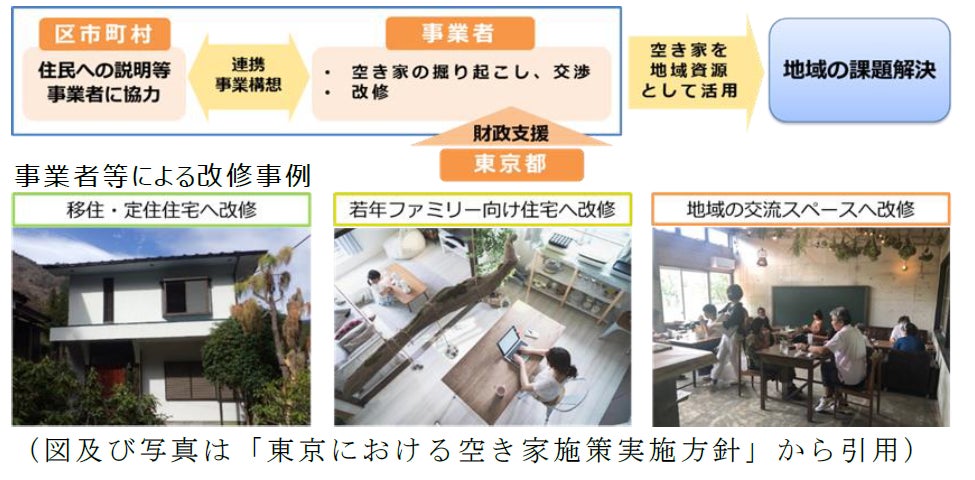 民間事業者等が区市町村が抱える地域課題を踏まえて事業を構想し、空き家の掘り起こしと改修を行うことにより、区市町村と連携しながら地域課題の解決を目指す取組に対して、都が複数年度(最大5年)にわたって財政支援を行う事業です。