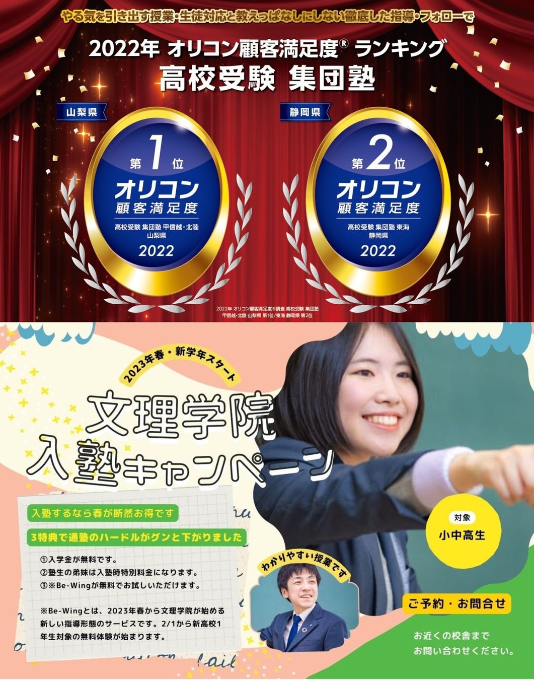 2022年オリコン顧客満足度®ランキング山梨県1位、静岡県2位の文理学院が、1/27(金)より新年度生受付を開始します。小中学生は3月、高校生は4月から新年度授業がスタートです。