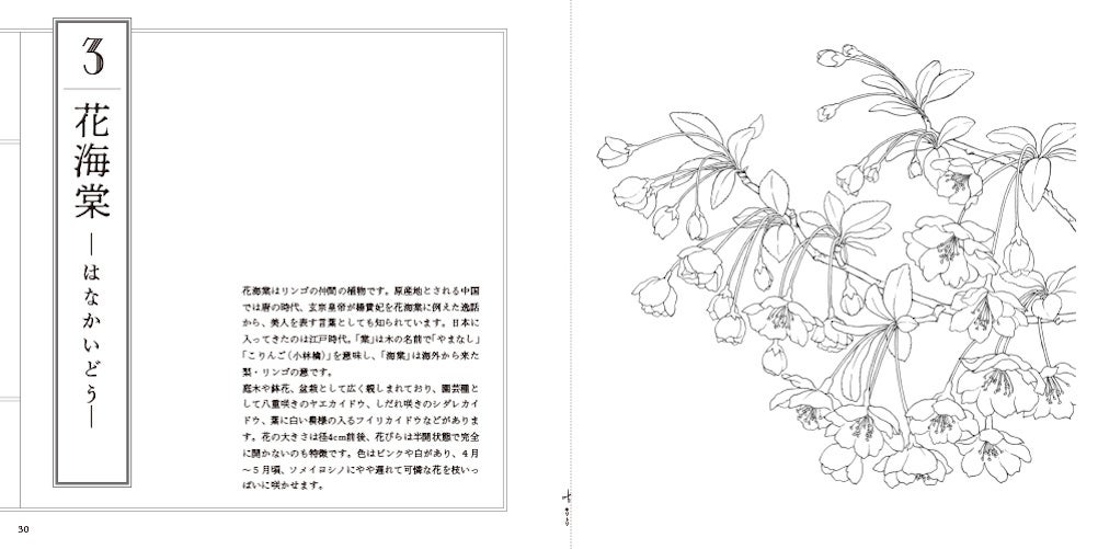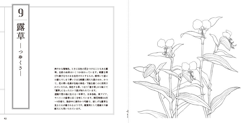 天下泰平の江戸時代。当時は輸入や参勤交代で多くの植物が江戸に持ち込まれました。美しくめずらしい植物に江戸庶民は魅了され、空前の園芸ブームが巻き起こります。本書では「江戸庶民が愛でたであろう草花」を19種選び、植物図譜のように細かく表現しました。経年劣化した和紙のように色合いなども再現しています。線画対向には花の特徴や名前の由来などを紹介。塗り絵を楽しみながら花の知識も深めることができます。