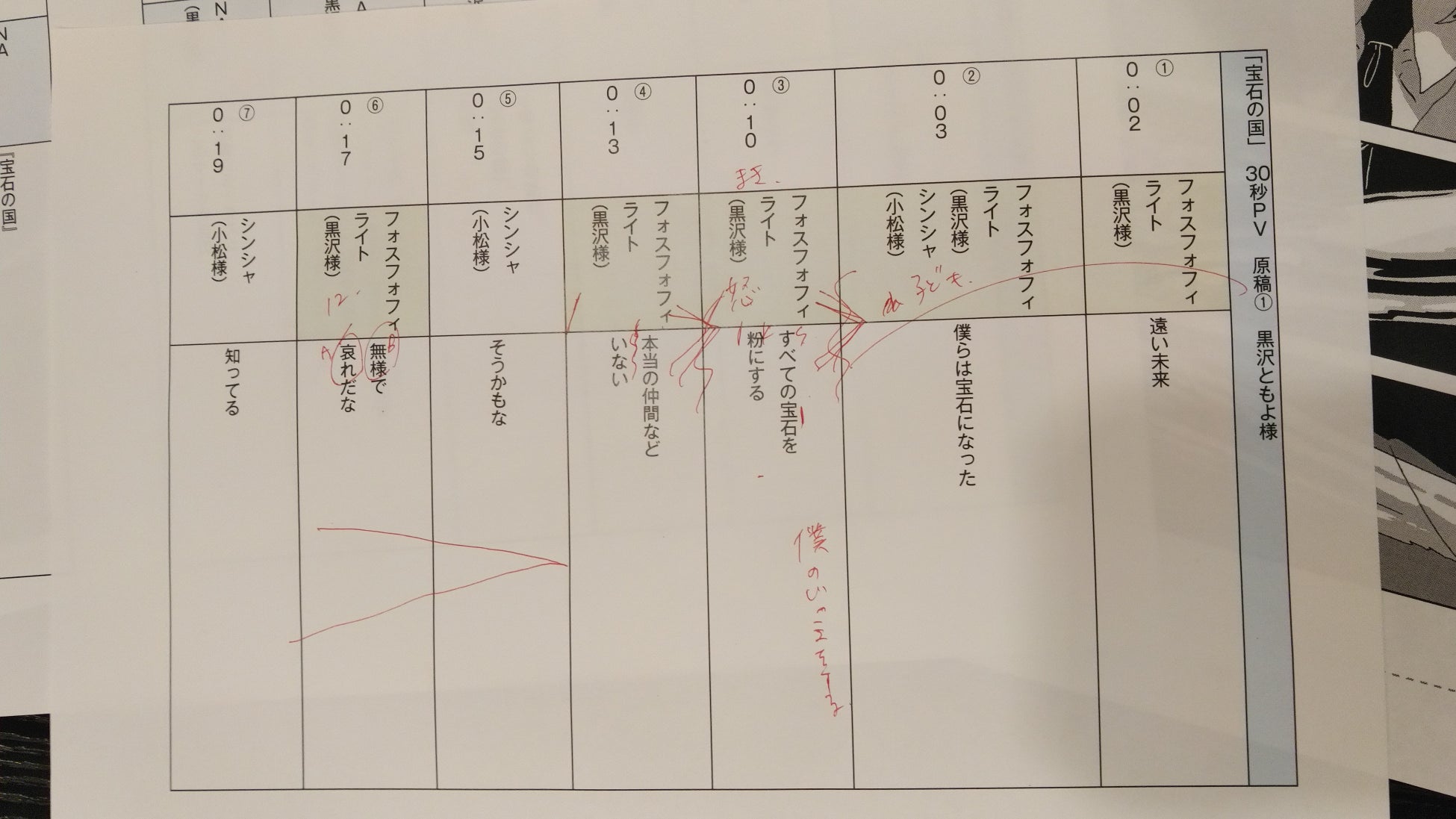 CMに出演していただきました声優の黒沢ともよさんは、5年ぶりのフォス役ということでかなりの緊張と気合いの入りようでしたが、ナレーション原稿に目を通して思わず「見たこともないフォスがいる!」と絶句!最新刊12巻に登場したフォスの姿に驚いてましたが、さすがに黒沢さん。収録はほぼ一発OKでした。変わり果てたフォスとシンシャとのやりとりをご堪能ください。