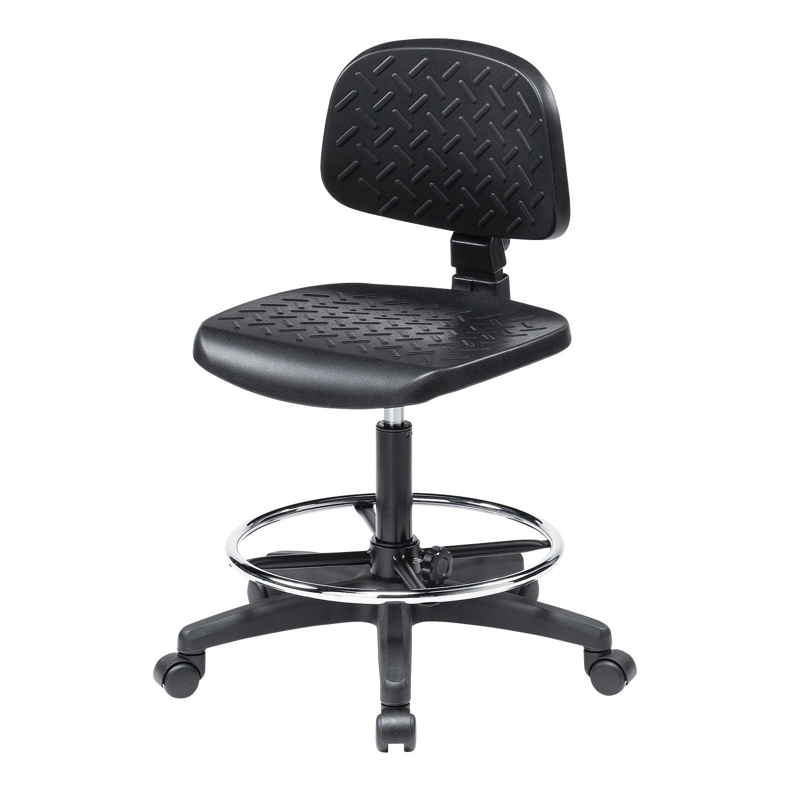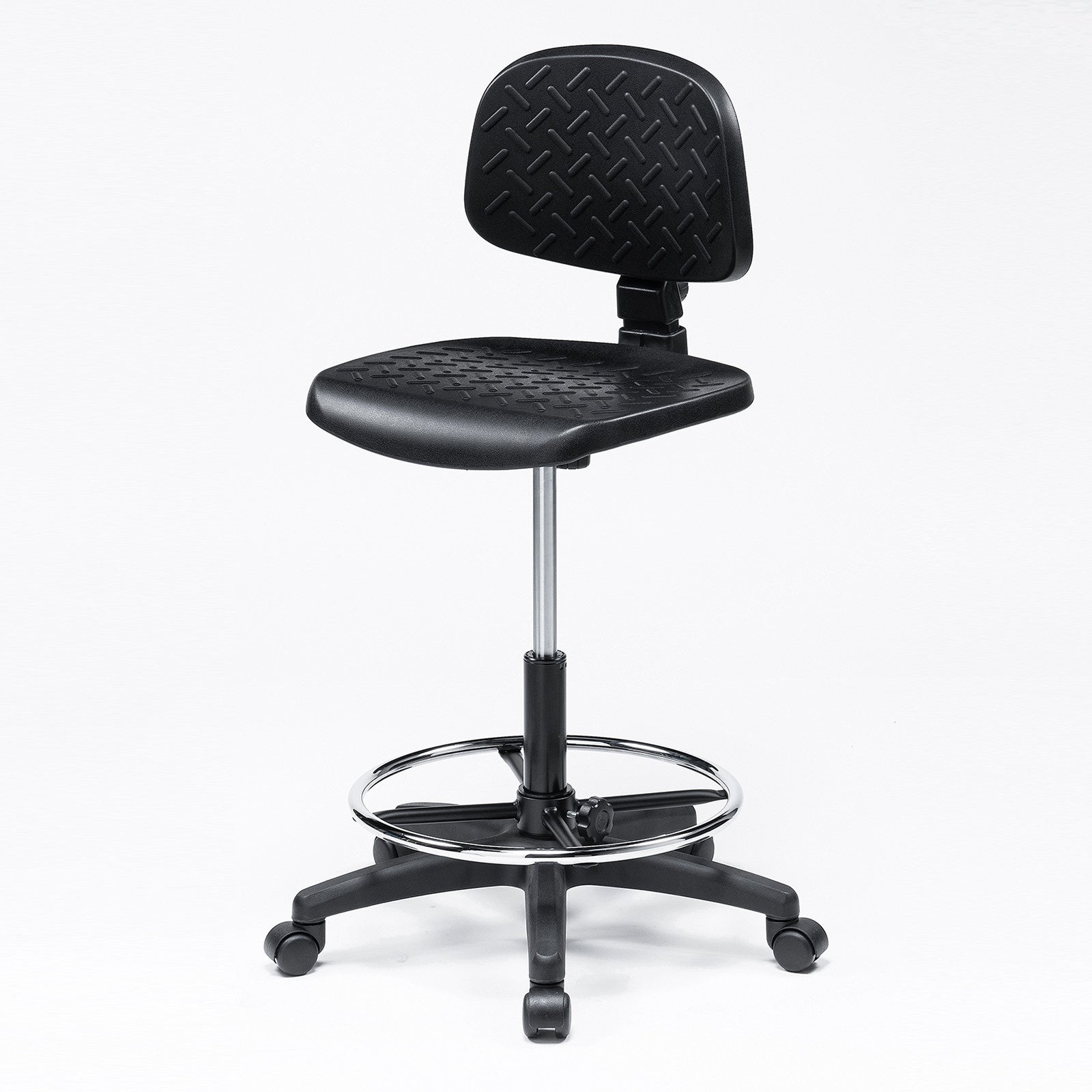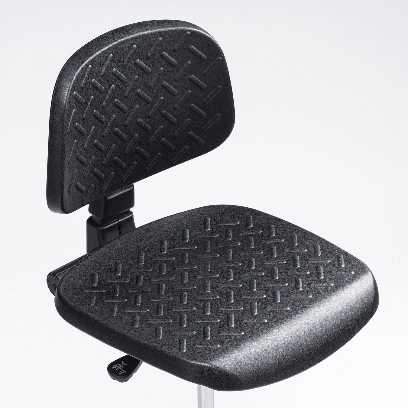 座面と背もたれは、汚れても簡単に拭きとれるポリウレタン一体成型を採用、さらに表面は滑り止め加工を施しています。座面は程よい弾力があり、快適に座り作業を行えます。