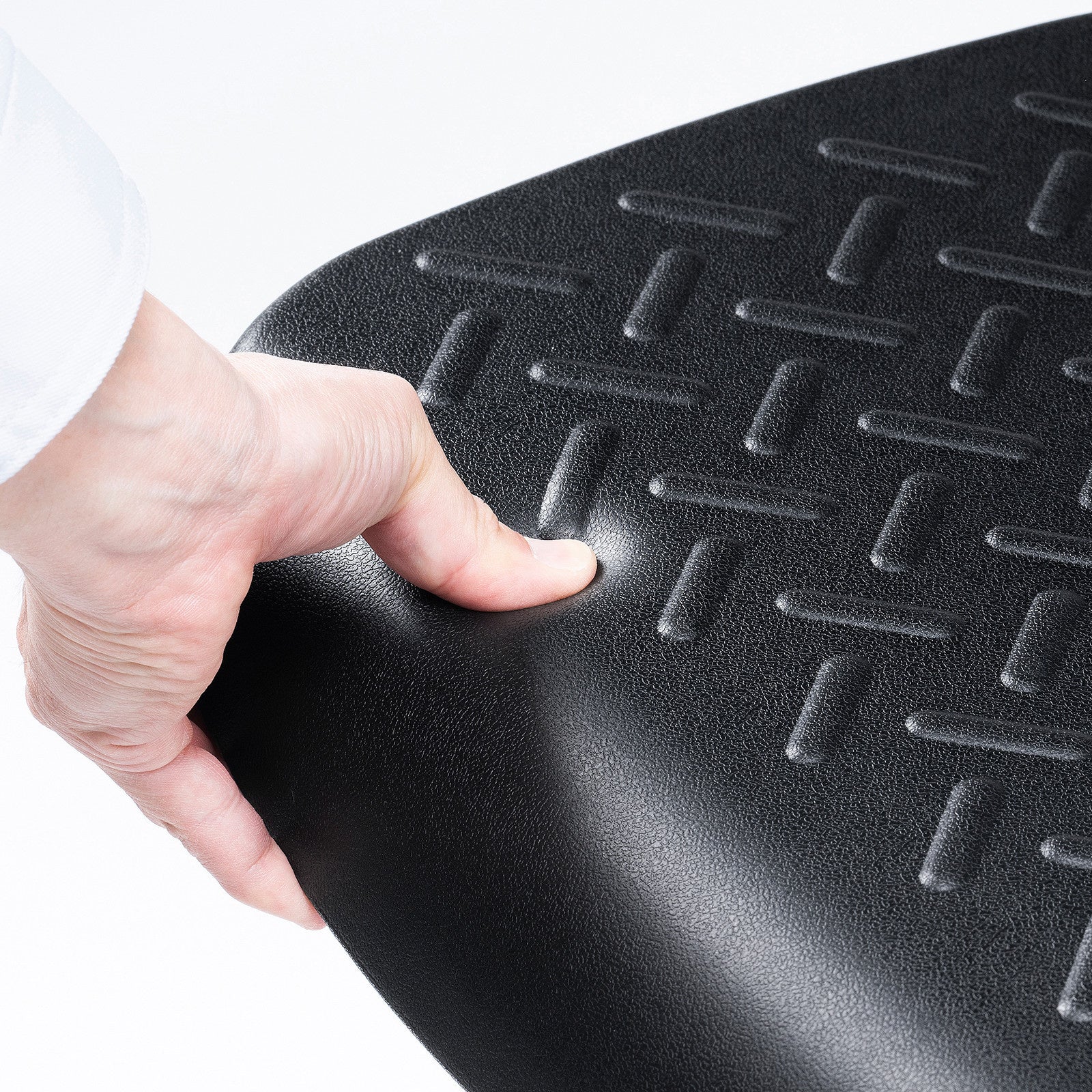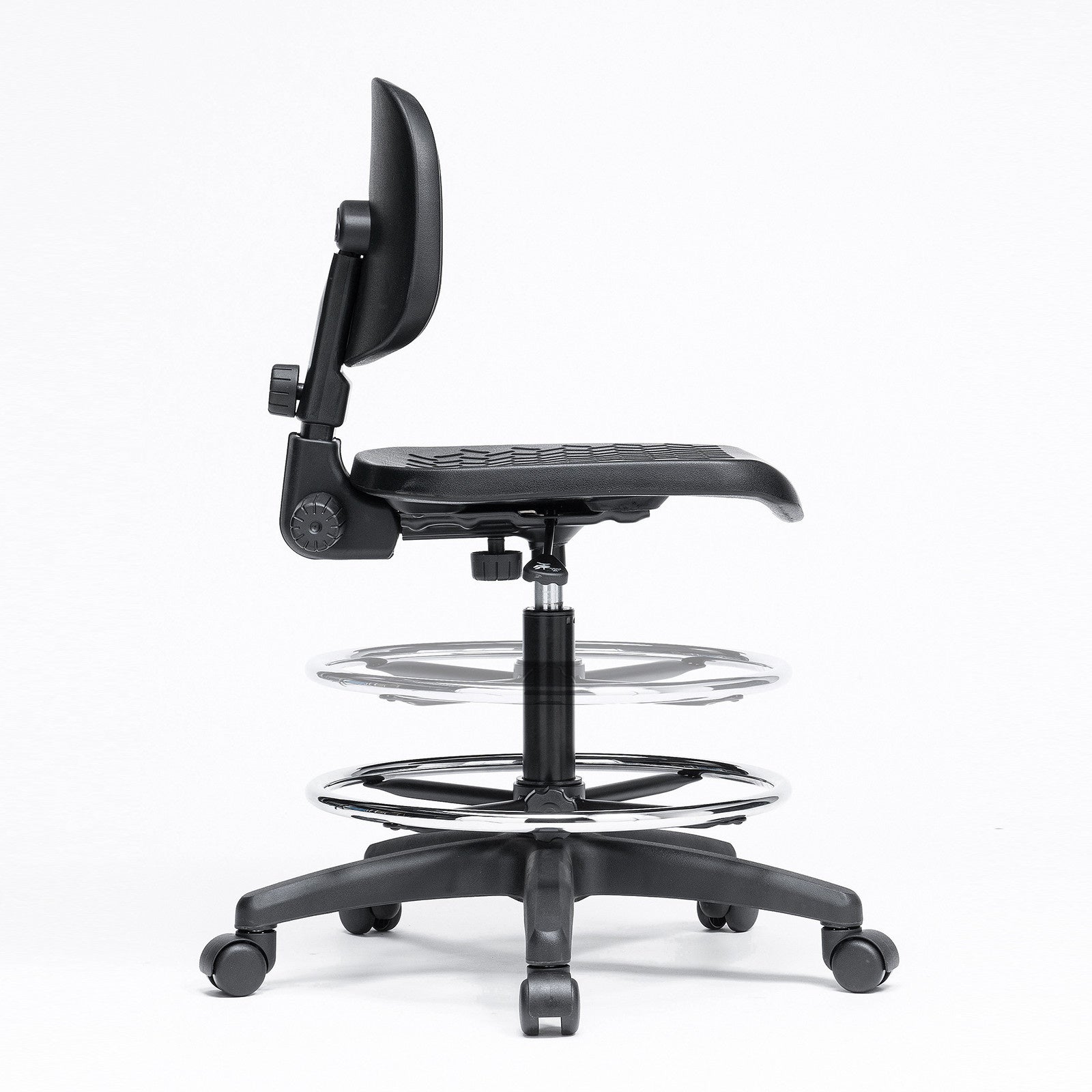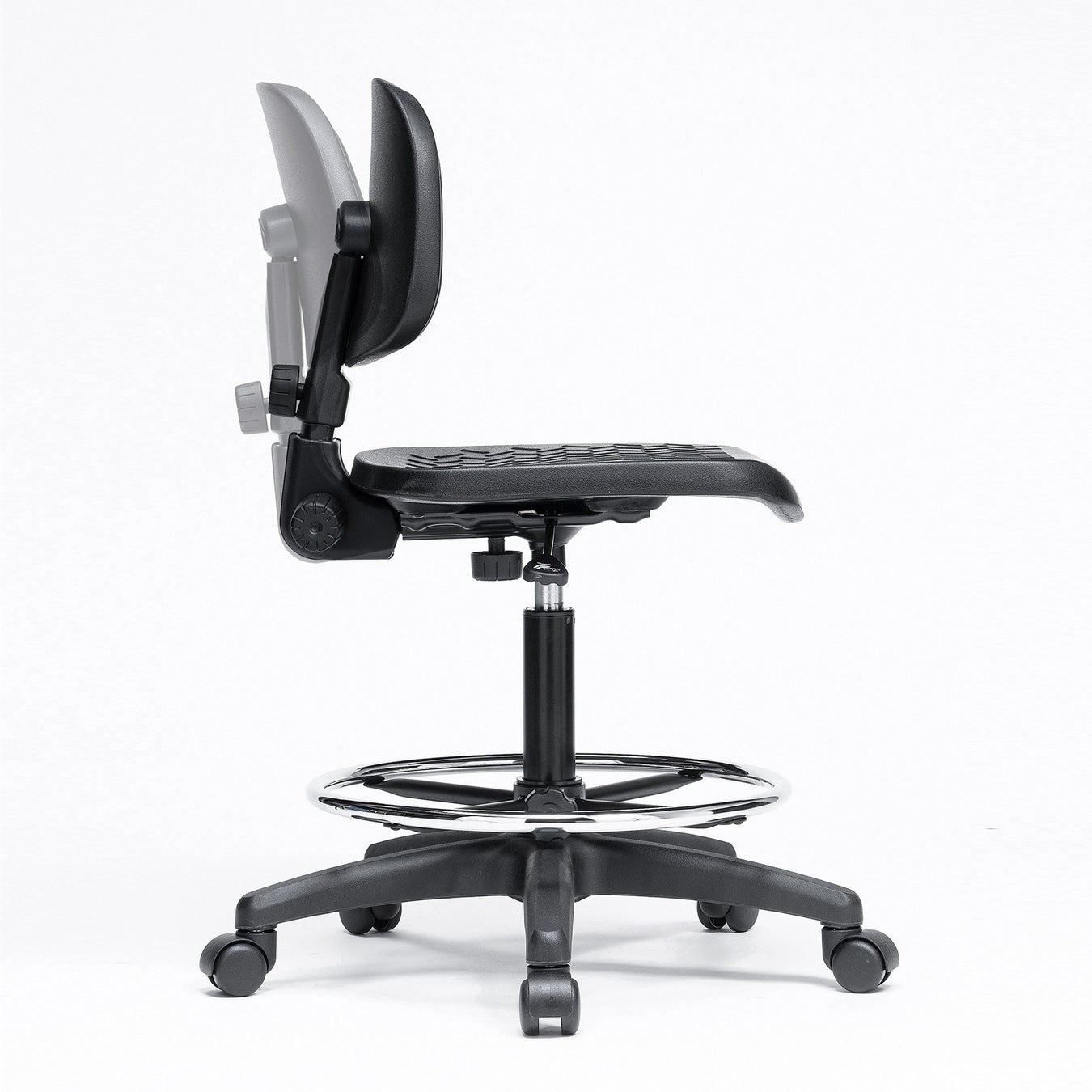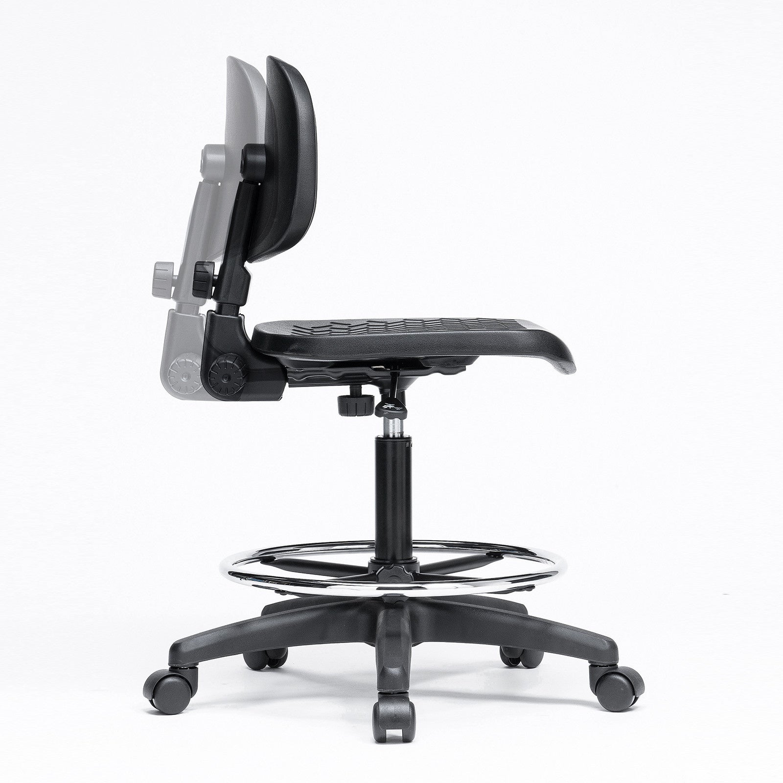座面と背もたれは、汚れても簡単に拭きとれるポリウレタン一体成型を採用、さらに表面は滑り止め加工を施しています。座面は程よい弾力があり、快適に座り作業を行えます。