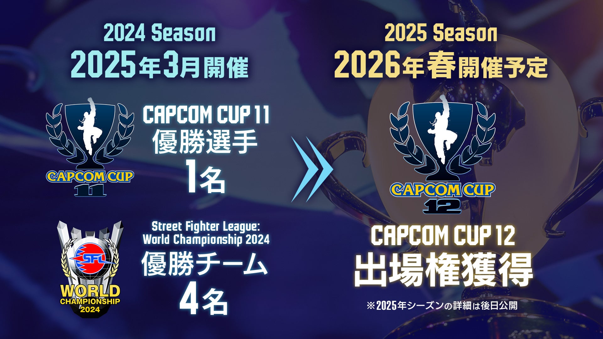 今シーズン行われる「CAPCOM CUP 11」優勝選手1名、および「ストリートファイターリーグ: ワールドチャンピオンシップ 2024」優勝チーム所属選手4名は「CAPCOM CUP 12」出場権を獲得します。