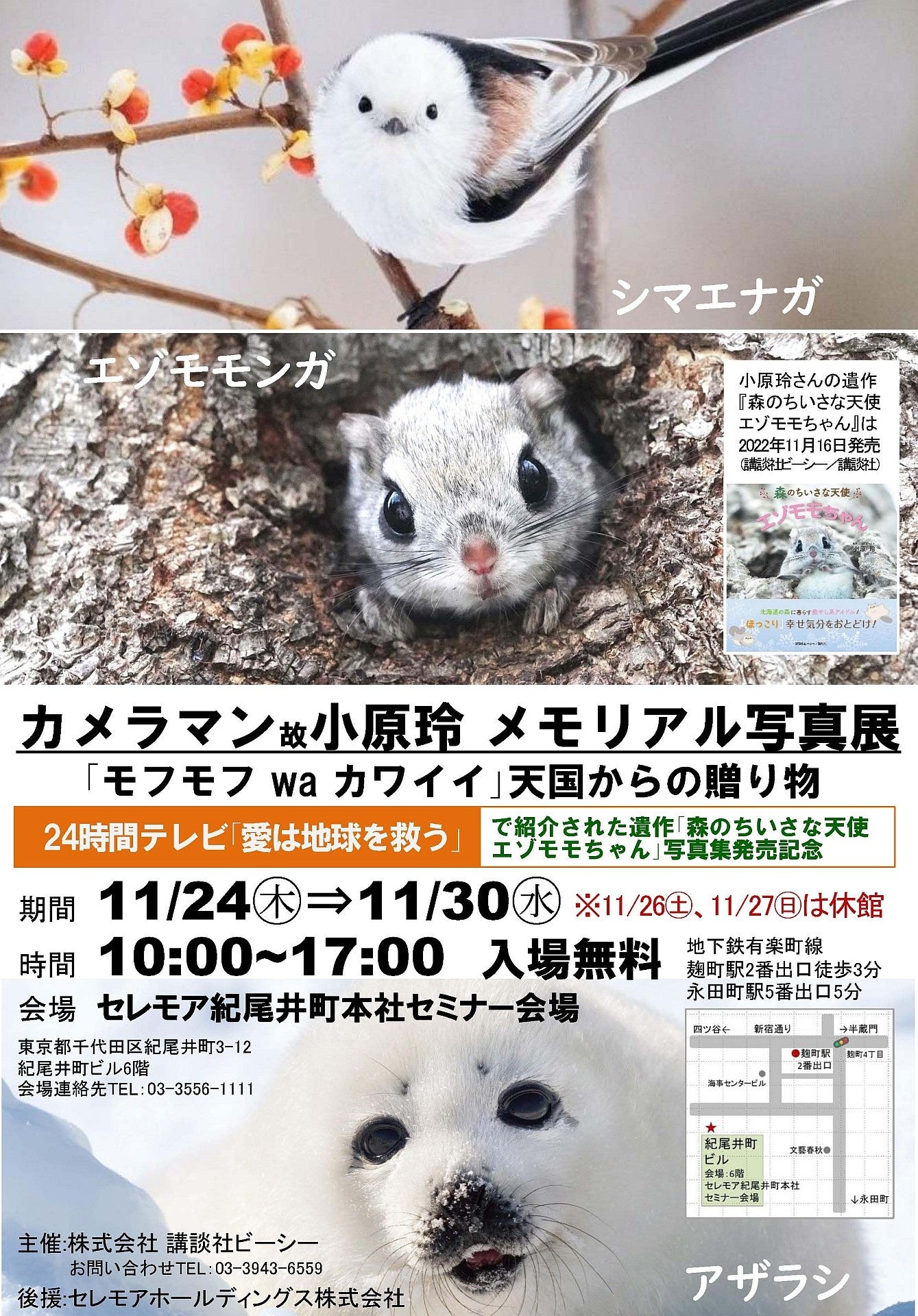 今回の写真展「『モフモフwaカワイイ』天国からの贈り物」では、小原さんの遺作となった写真集『森の小さな天使 エゾモモちゃん』からとっておきのカットを展示するとともに、ブームのきっかけとなった「シマエナガ」や「アザラシの赤ちゃん」の写真も展示する。