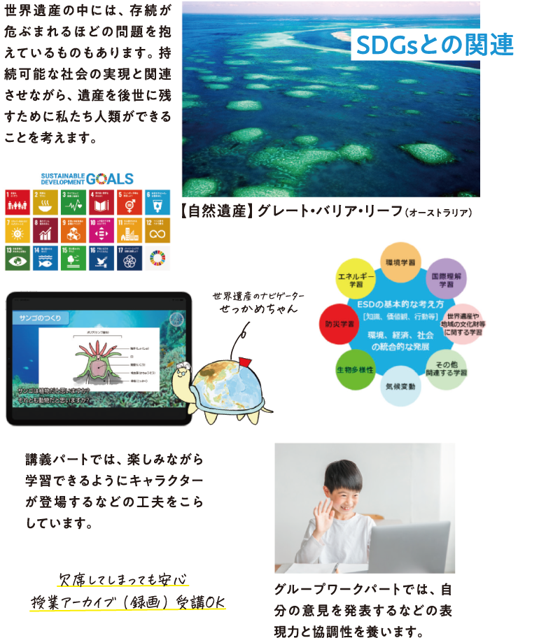 世界遺産の中には、存続が危ぶまれるほどの問題を抱えているものがあります。持続可能な社会の創り手として、遺産を後世に残すために私たち人類ができることは何か、考える力が身につきます。