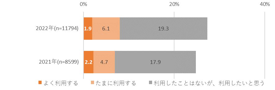 注目を集めているオーディオブックについて利用経験と利用意向を聞いたところ、「よく利用する」が1.9%、「たまに利用する」が6.1%となりました。両者を合わせたオーディオブックの利用率は8.0%となり、昨年調査から1.9ポイント増加しています。また、「利用したことはないが、利用したいと思う」と回答した利用意向を持つ人は19.3%で、同じく1.4ポイント増加しています。