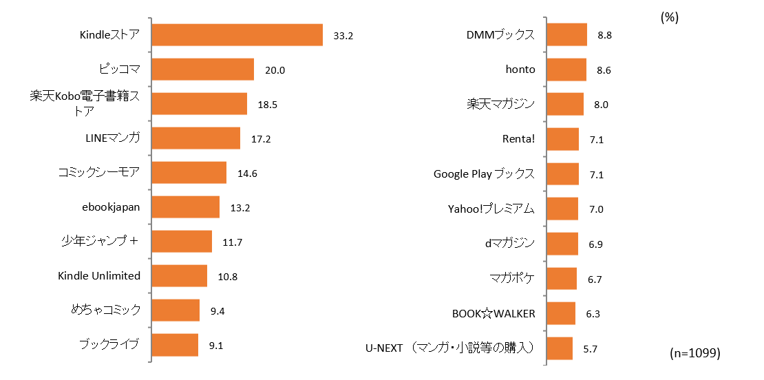 利用している電子書籍サービスやアプリのうち購入・課金したことのある電子書籍サービスやアプリを聞いたところ、「Kindleストア」が33.2%で最も高く、2位に「ピッコマ」が20.0%、3位に「楽天Kobo電子書籍ストア」が18.5%で続きます。