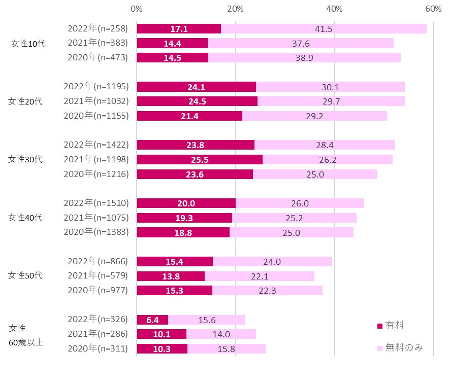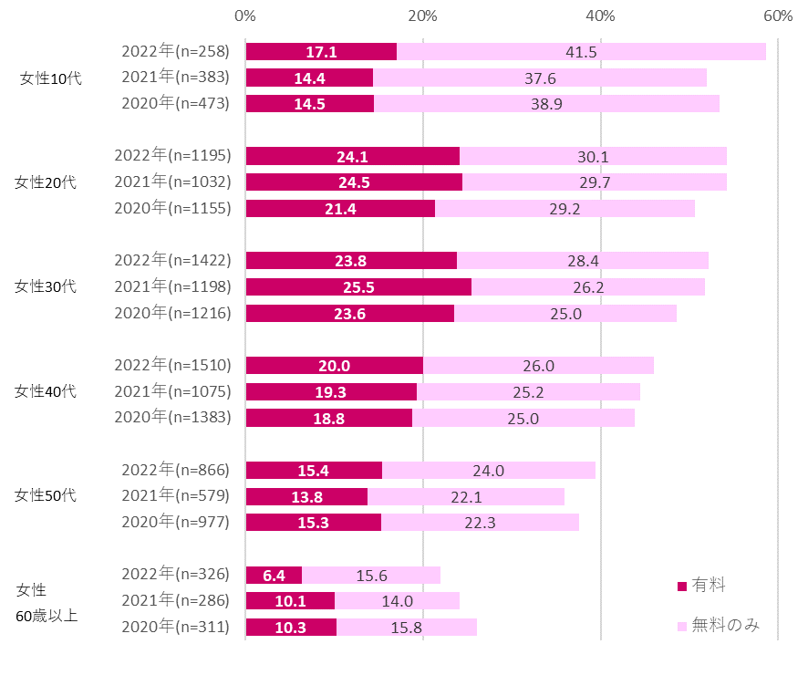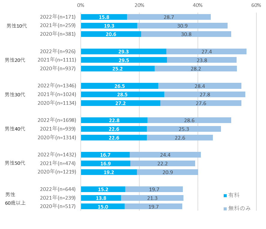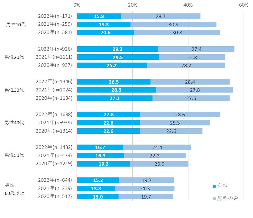 有料での利用率が高いのは男性20代の29.3%、男性30代の26.5%、女性20代の24.1%であり、男女とも20代、30代の利用率が高いです。無料の電子書籍のみの利用率が高いのは、女性10代の41.5%で、女性20代の30.1%、男性10代の28.7%が続きます。昨年調査時よりも有料での利用率が増加している年代は男性40代・60歳以上、女性10代・40代・50代となり、有料での利用率が低下している年代の方が多くなっています。