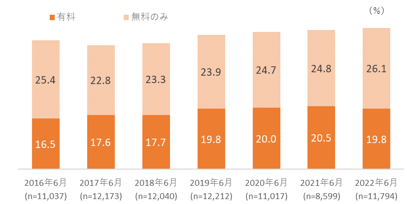モバイル(スマートフォン・タブレット)ユーザーに対して、電子書籍の利用率を調査したところ、有料の電子書籍利用率は19.8%となり、昨年から0.7ポイントの減少となりました。一方で、無料の電子書籍のみの利用率は昨年からは1.3ポイント増加して26.1%となりました。