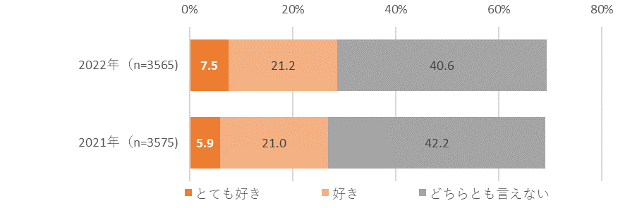 この1年は日本国内でも韓国発のWEBTOON熱が加速しています。WEBTOONといわれるスマートフォンでの購読に最適化した縦スクロールのカラーのマンガに対する好みを聞くと、「とても好き」「好き」を合わせた好意的な評価は28.7%となりました。「とても好き」は昨年調査から1.8ポイント増加しています。