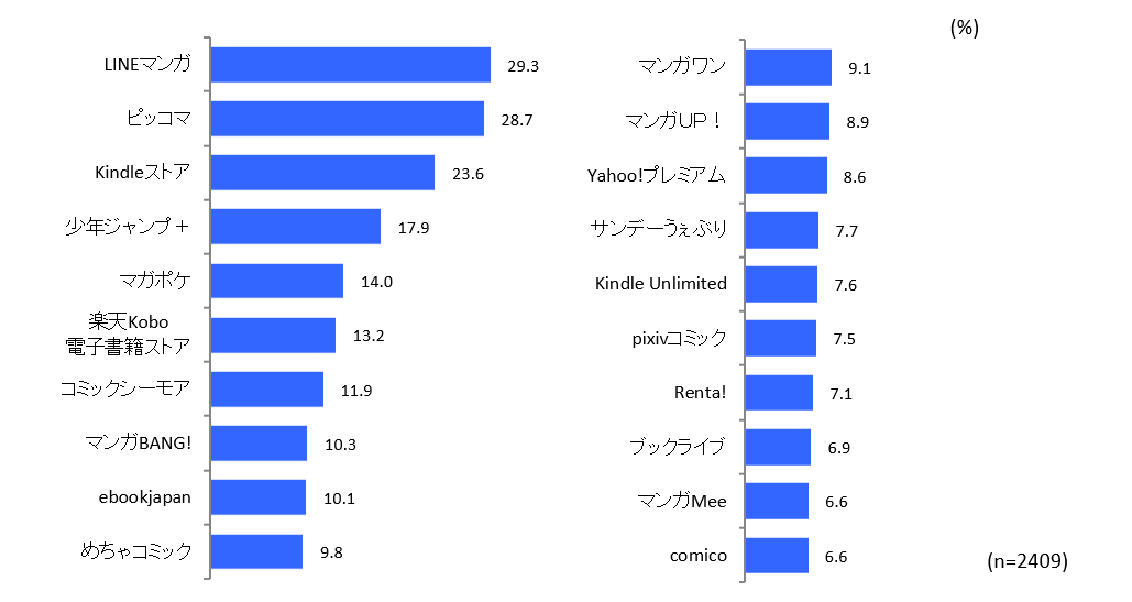 有料、無料を問わずに電子書籍を利用していると回答した人に、利用している電子書籍サービスやアプリを聞いたところ、「LINEマンガ」が29.3%で最も高く、「ピッコマ」が28.7%、「Kindleストア」が23.6%、「少年ジャンプ+」が17.9%、「マガポケ」が14.0%で続いています。上位5つのうち、4つがメディア型のマンガアプリとなっています。