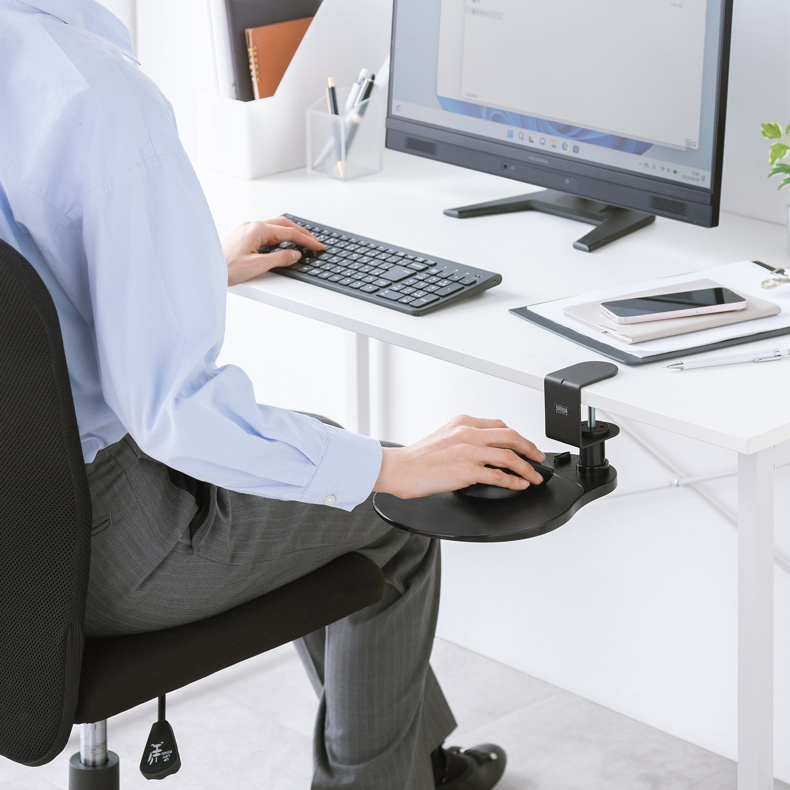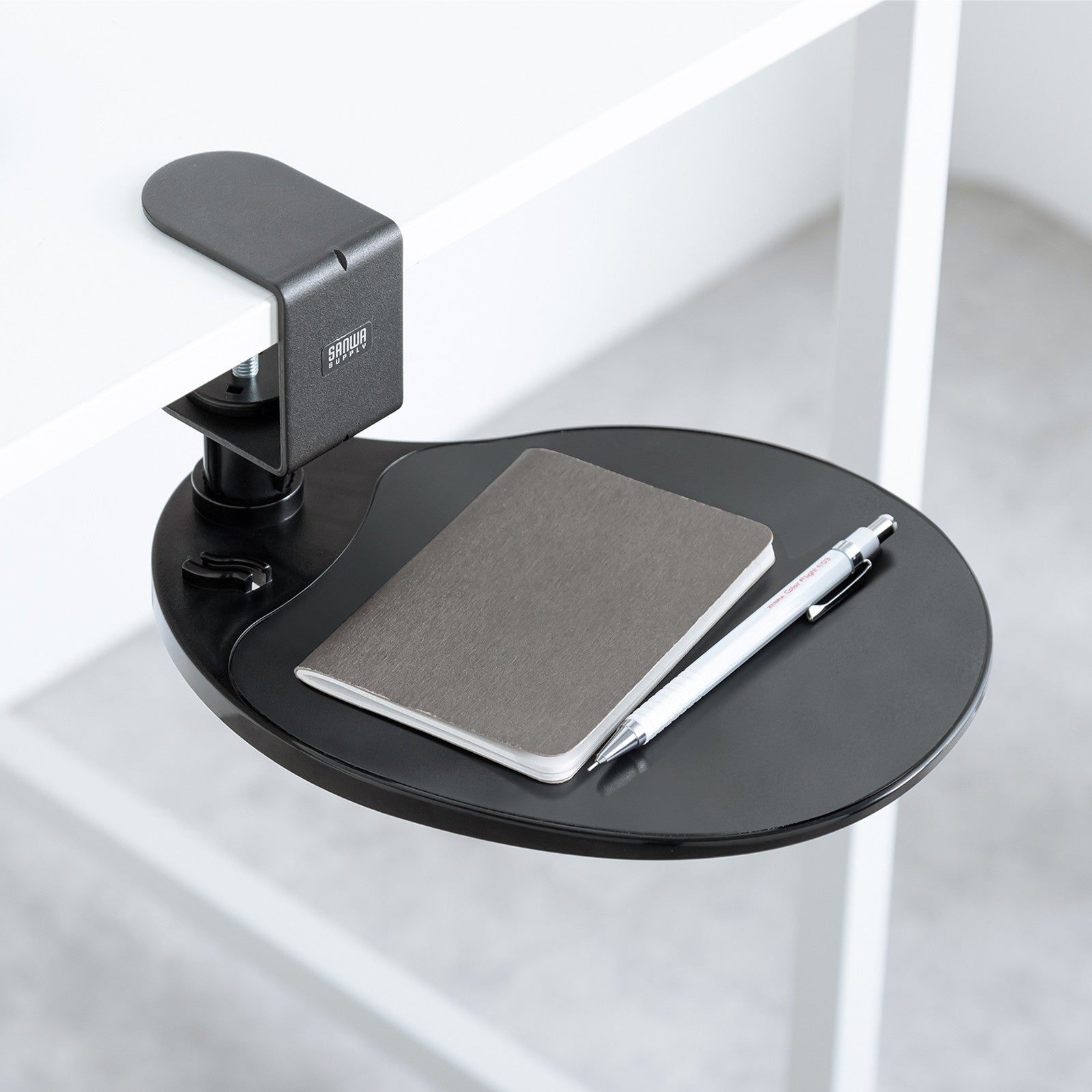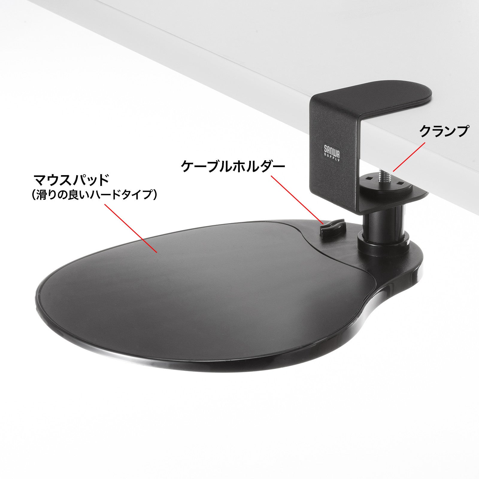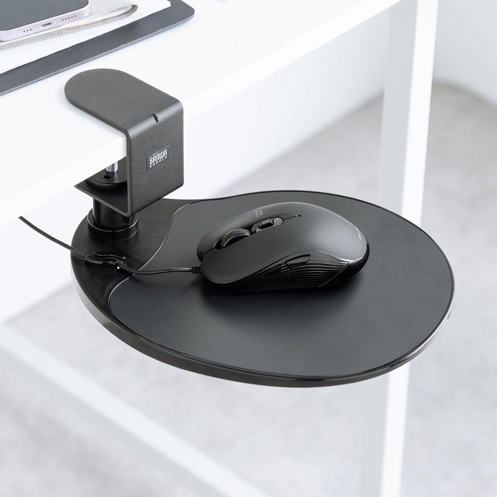 デスク天板を挟むだけのクランプ式で取り付けは簡単、テーブル部分は360°回転するので、使わないときはマウスを載せたままデスク下へ収納できます。狭いデスクをお使いの方、机上スペースを広く利用したい方におすすめです。