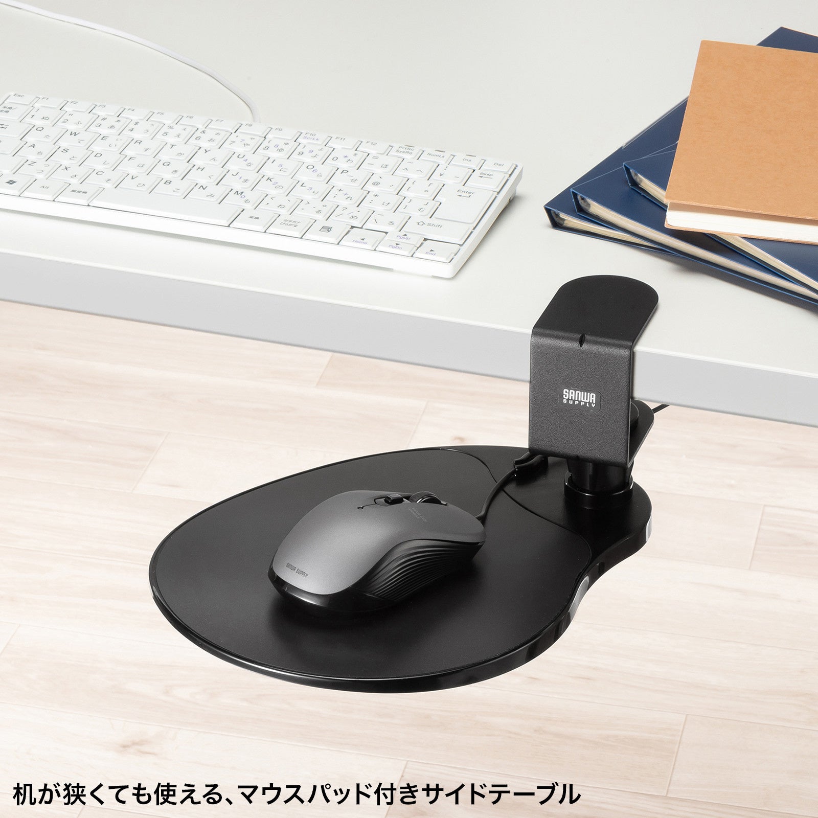 デスクに取り付けて、天板の下にマウススペースを作ることができるマウスパッド付きサイドテーブルです。