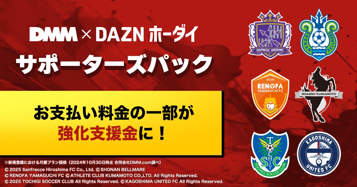 合同会社DMM.com(本社:東京都港区、会長 兼 CEO:亀山敬司、以下DMM)は、2025明治安田Jリーグのクラブのサポーターに向けて、お支払い料金の一部がクラブの強化支援金に充てられる応援パッケージに、サンフレッチェ広島、湘南ベルマーレ、レノファ山口FC、ロアッソ熊本、栃木SC、鹿児島ユナイテッドFCを追加いたします。