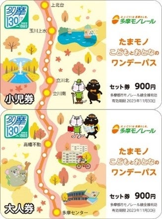 ※「たまモノこどもとおとなのワンデーパス」は、900円で多摩モノレール全線を1日自由に乗り降りできる小児(小学生)と大人(中学生以上)の乗車券各1枚のセット券です。通常の小児一日乗車券450円と大人一日乗車券890円の合計額1,340円と比較し、440円お得な乗車券です。