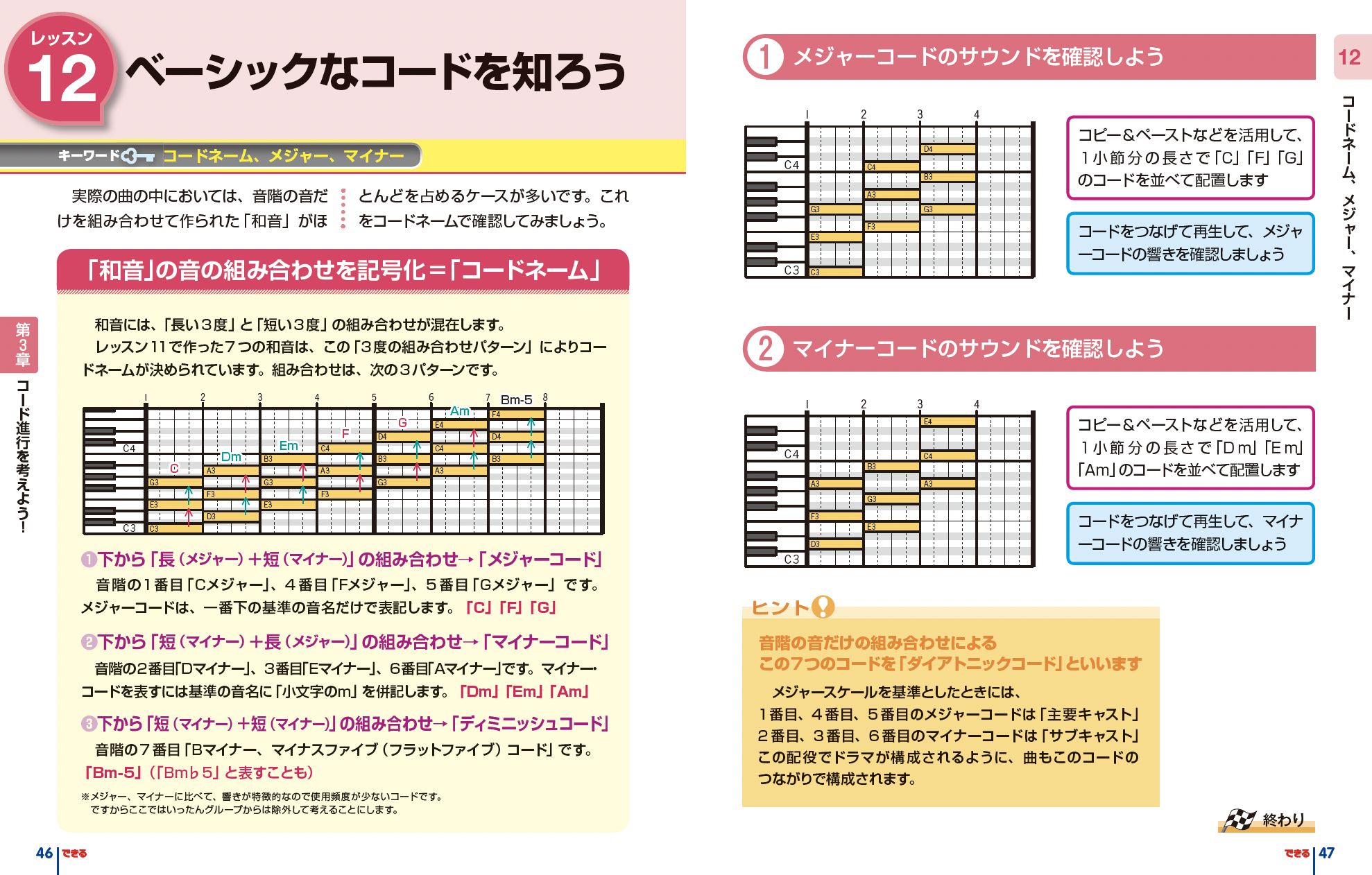 「第3章 コード進行を考えよう!」の「レッスン12 ベーシックなコードを知ろう」より。よく使われるコードを覚え、その組み合わせで曲を作っていきます