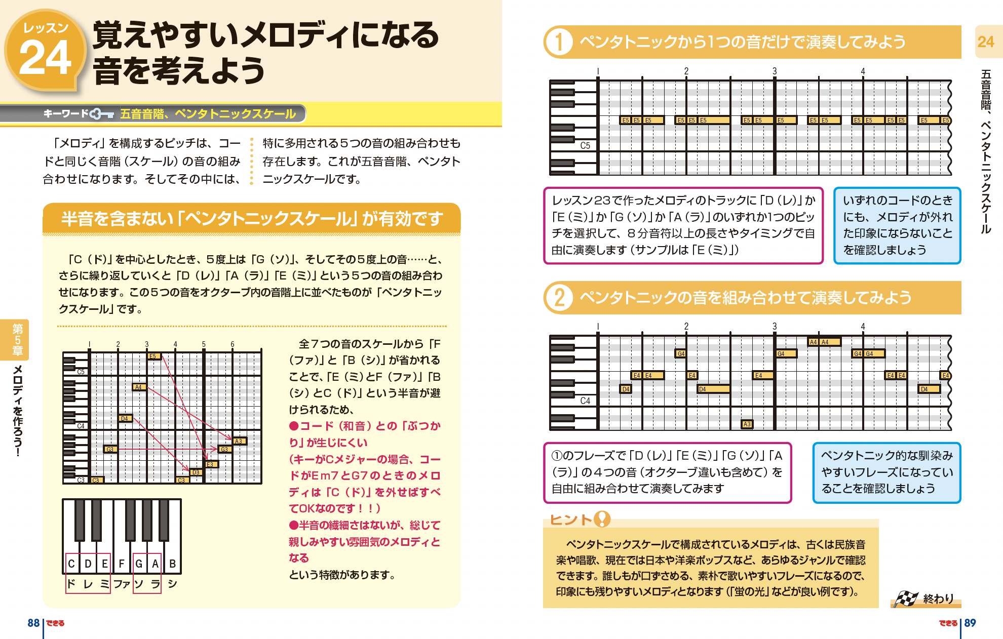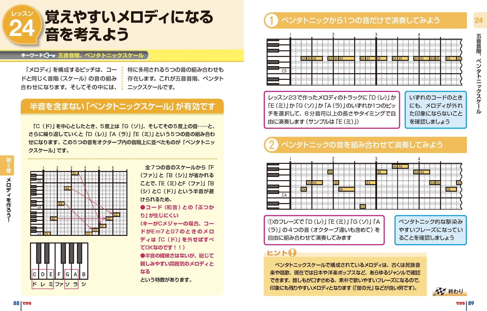 「第5章 メロディを作ろう!」の「レッスン24 覚えやすいメロディになる音を考えよう」より。本書ではある音階を使うことで失敗の少ないメロディづくりを伝授します