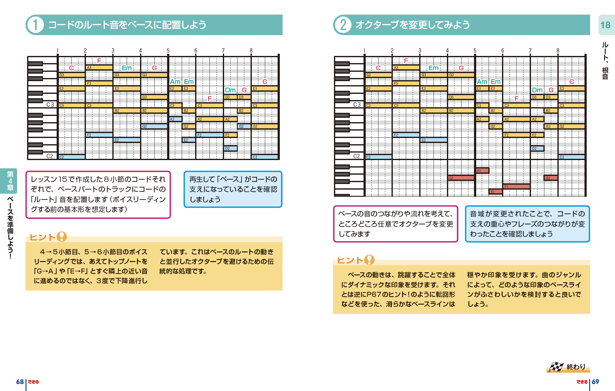 「第4章 ベースを準備しよう!」より「レッスン18 土台となるベースが弾く音を考えよう」実践部分。コード進行にベースを配置していきます