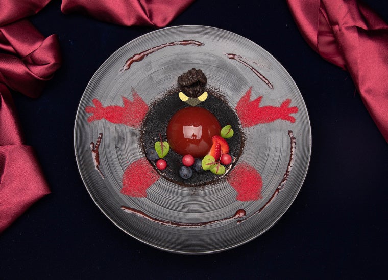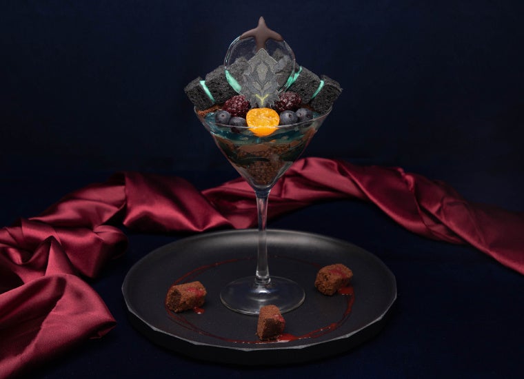 ねぶたにもなった、『NGS』に登場するダークファルスの第1形態をイメージした、黒に青が映えるチョコレートパフェ。