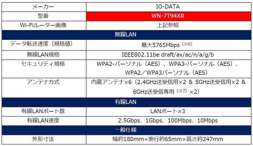 今回提供開始Wi-Fiルーターは、IO-DATAのWN-7T94XRです。新規格「Wi-Fi 7( IEEE802.11be)」に対応し、6GHz最大5765Mbps(規格値)、5GHz最大2882Mbps(規格値)、2.4GHz最大688Mbps(規格値)の3つの周波数帯で高速通信が可能です。(※5) また、2.5GbpsのLANポート対応で有線LAN接続のパソコンやゲーム機、Wi-Fi接続のスマホやノートパソコンなどもハイパフォーマンスでゲームも動画も安定して楽しむことができます。