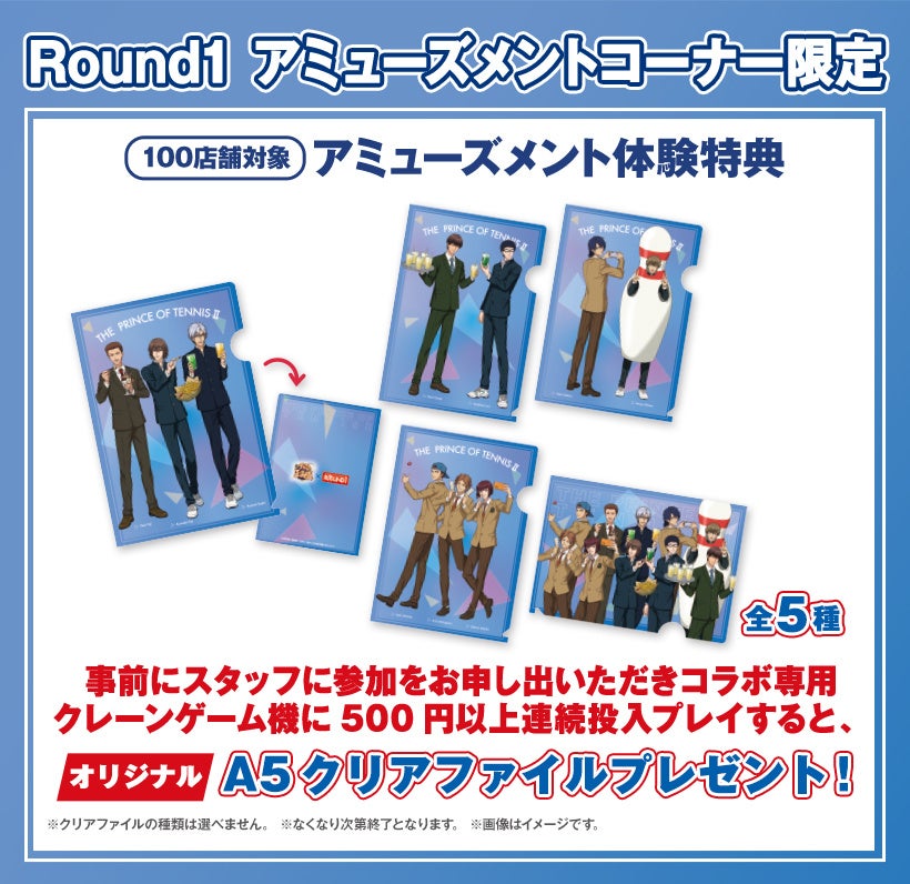 事前にスタッフへ参加をお申込みいただき、コラボ専用クレーンゲーム機に500円以上連続投入プレイをすると、オリジナルA5クリアファイル[全5種]をランダムで1枚プレゼント!