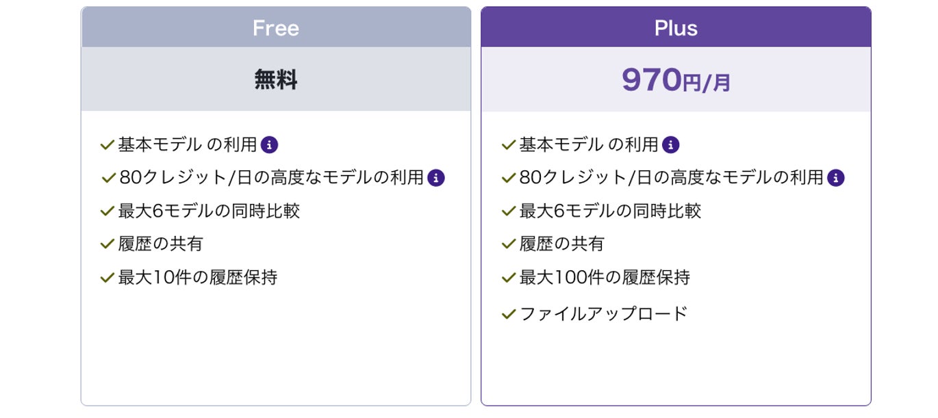 このたび提供を開始する有料プラン「Plus」は、無料プランの機能に加え、100件の履歴保持や、ファイルのアップロードといった高度な機能が月額970円で使えるようになります。