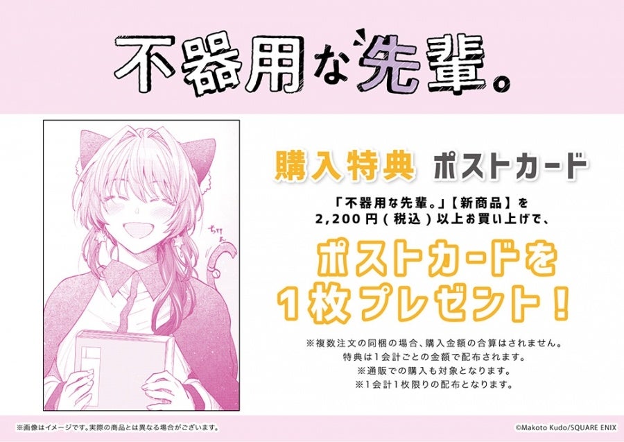 期間中に会場内にて「不器用な先輩。」【新商品】または【新商品と関連書籍】を2,200円(税込)以上お買い上げで、特典ポストカード(全1種)を1枚プレゼント!