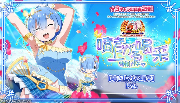 株式会社セガは、配信中の人気テレビアニメ「Re:ゼロから始める異世界生活」公式スマートフォン向けゲーム『Re:ゼロから始める異世界生活 Lost in Memories(以下、『リゼロス』)』にて、本日9月9日(金)より、リリース開始から2周年を記念して、「【噴き上がる喝采】レム★3」、記憶結晶「笑顔がこぼれる雪祭り★3」の出現率がUPする「2周年特別ガチャ【噴き上がる喝采】」と、「【小さな魔獣使い】メィリィ★3」、記憶結晶「このイベントもあったよなぁ★3」の出現率がUPする「【小さな魔獣使い】ガチャ」を開催します。