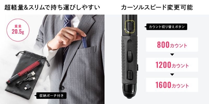 カウント切り替え可能で、800、1200、1600の3段階から選択でき、お好みに合わせた精度で操作が可能です。専用のポーチ付きで持ち運びがしやすく、レシーバーや充電ケーブルも一緒に管理できるため、外出時も便利です。