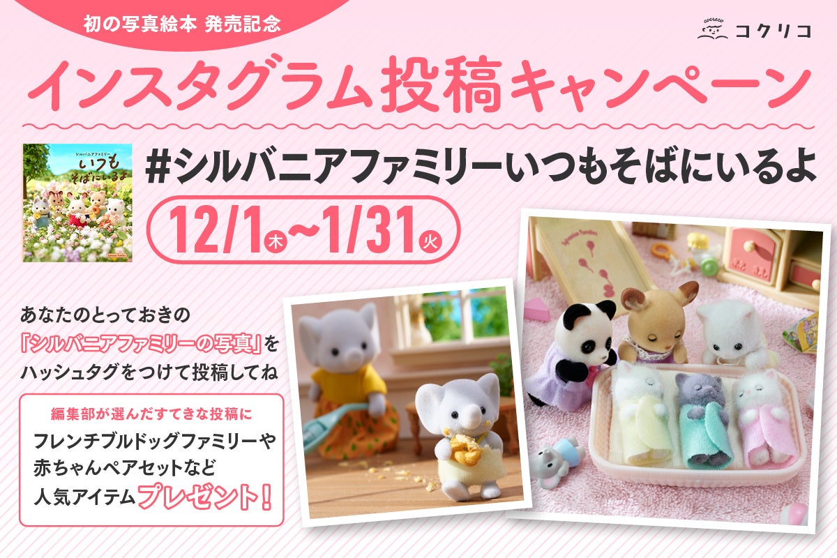 講談社コクリコInstagramアカウント(@cocreco_official)とシルバニアファミリー公式Instagramアカウント(@sylvanianfamilies_jp)の2つをフォローの上、あなたが撮影したシルバニアファミリーのとっておきのかわいい写真をハッシュタグ「#シルバニアファミリーいつもそばにいるよ」をつけてInstagramに投稿してください。