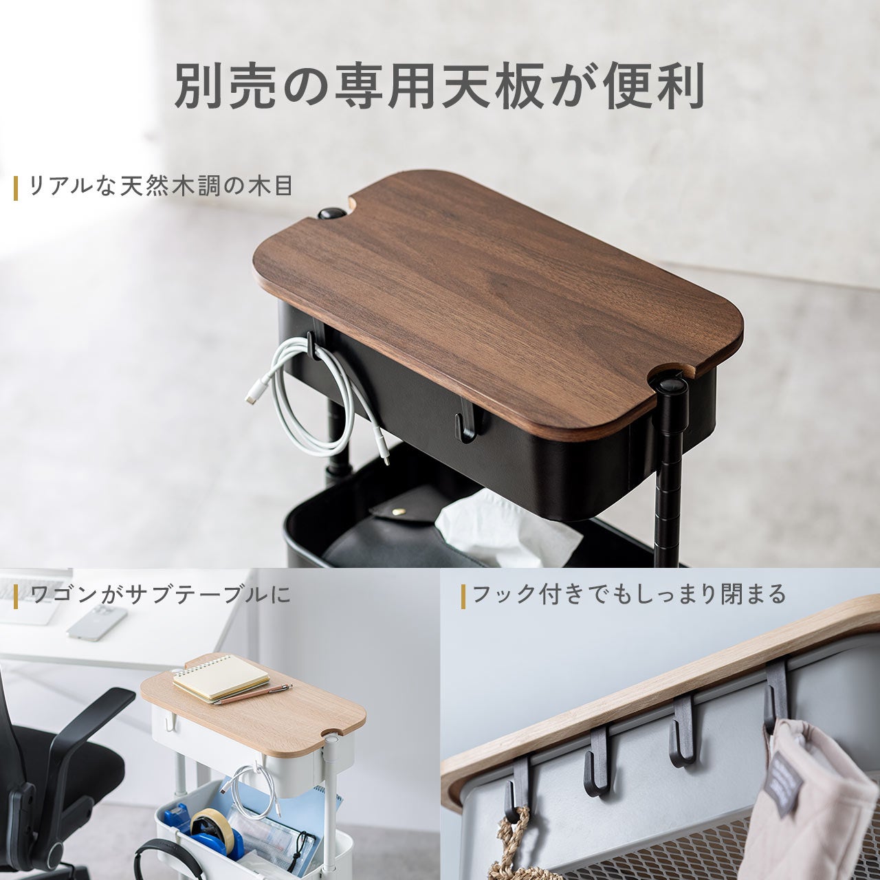 ・ワゴンの縁に引っ掛けて使えるフックが4本付属し、引っ掛けることで収納手段も増える