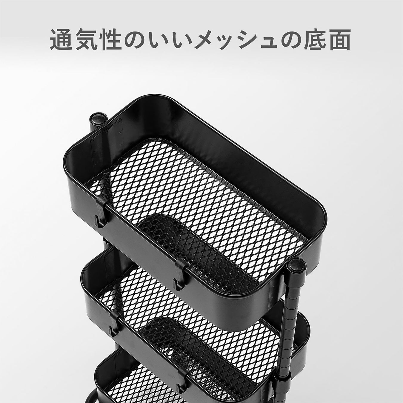 このワゴンの底面は、通気性に優れたメッシュ形状を採用しており、湿気がこもりにくく、ほこりの溜まりにくい設計です。これにより、キッチンや洗面所など、湿気を帯びやすい場所での使用に最適。常に清潔で快適な環境を保てます。