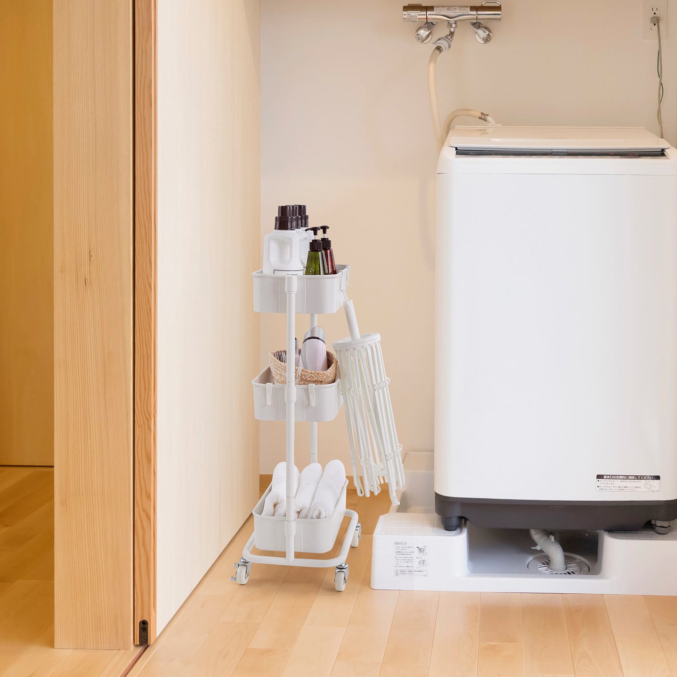 本体とワゴンには粉体塗装が施されているため、水に濡れても錆びにくいという特徴があります。キッチンや洗面所など、水まわりでの使用を想定して設計されており、耐久性にも優れています。