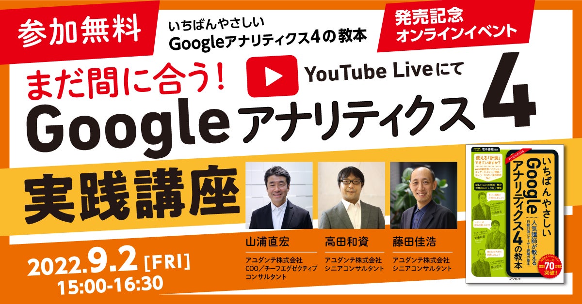 そこで当社では新刊『いちばんやさしいGoogleアナリティクス4の教本』(発売:2022年8月26日)の出版を記念して、本書著者3名による無料オンラインセミナーを実施します。