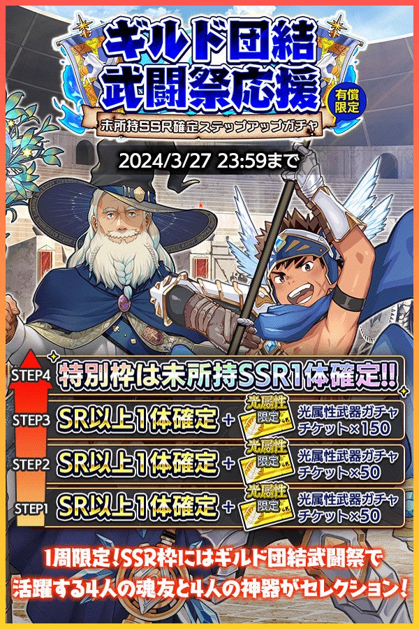 また、ステップごとにおトクなおまけがついた1周限定の「ギルド団結武闘祭応援未所持SSR確定ステップアップガチャ」も開催!