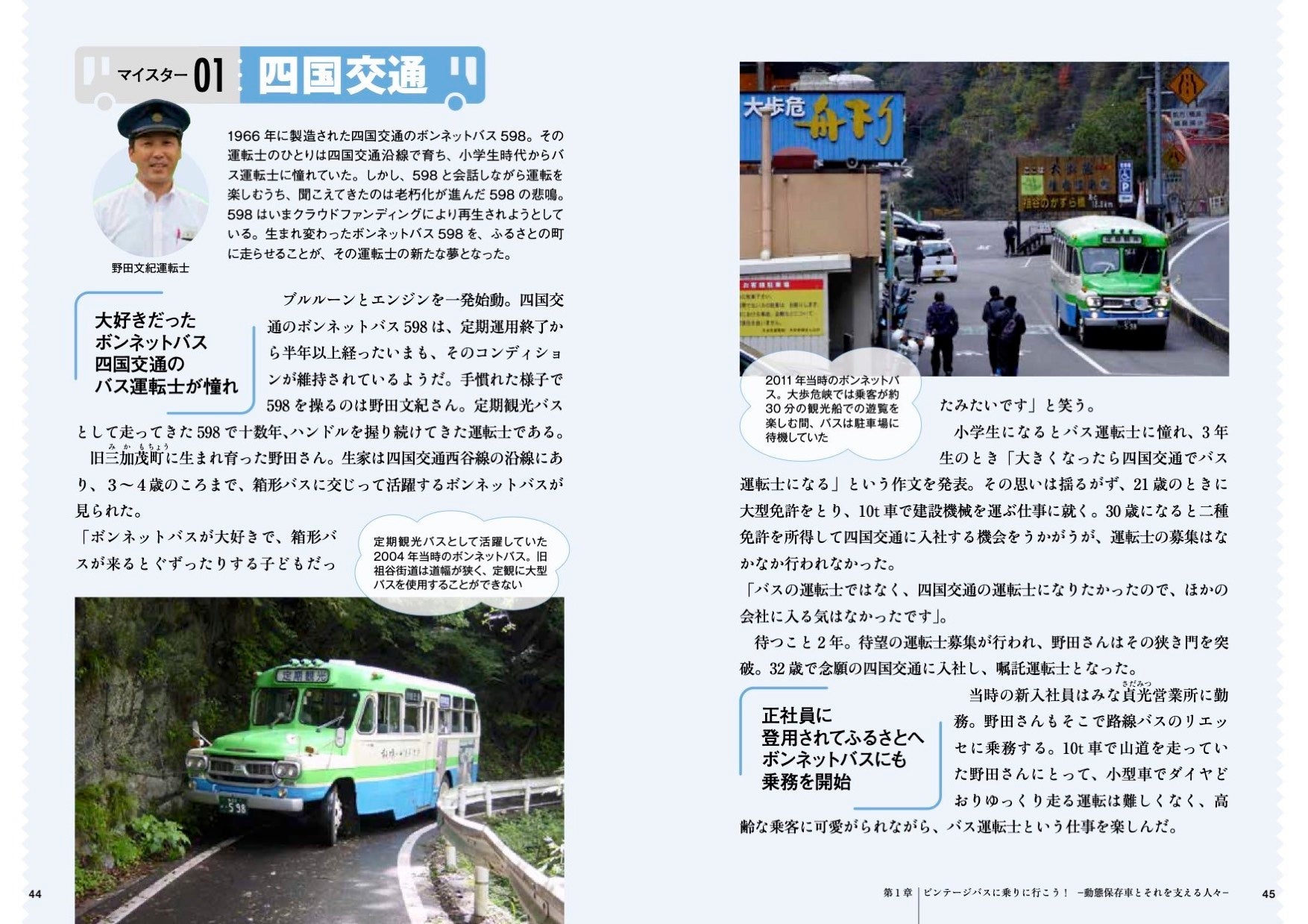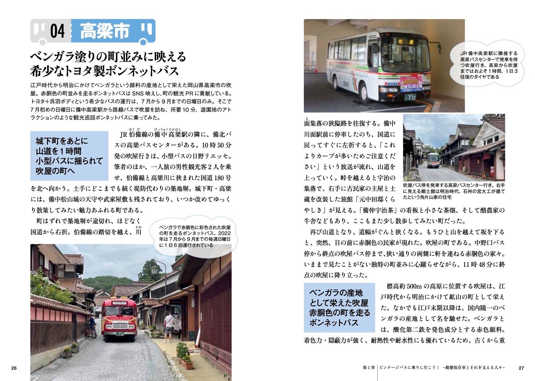 第1章では全国で活躍中のビンテージバスに乗車し、乗り心地や車窓風景をお伝えする乗車ルポを紹介。また、動態保存車両を支える現場のプロたちに話を伺います。