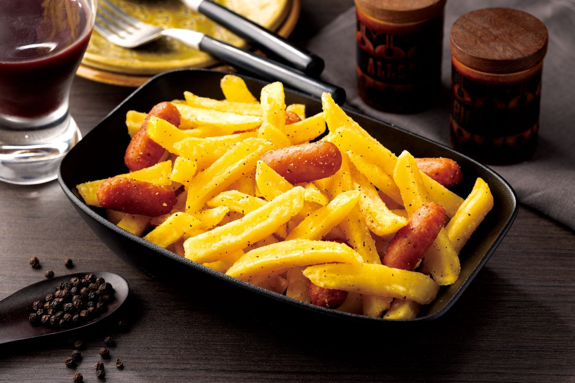 ・黒胡椒ポテト&ウインナー:ひとくちサイズのウインナーとフライドポテトに、にんにくの香りがきいた「黒胡椒パウダー」をまぶしました。黒胡椒のピリッとした刺激が、おつまみにピッタリな商品です。