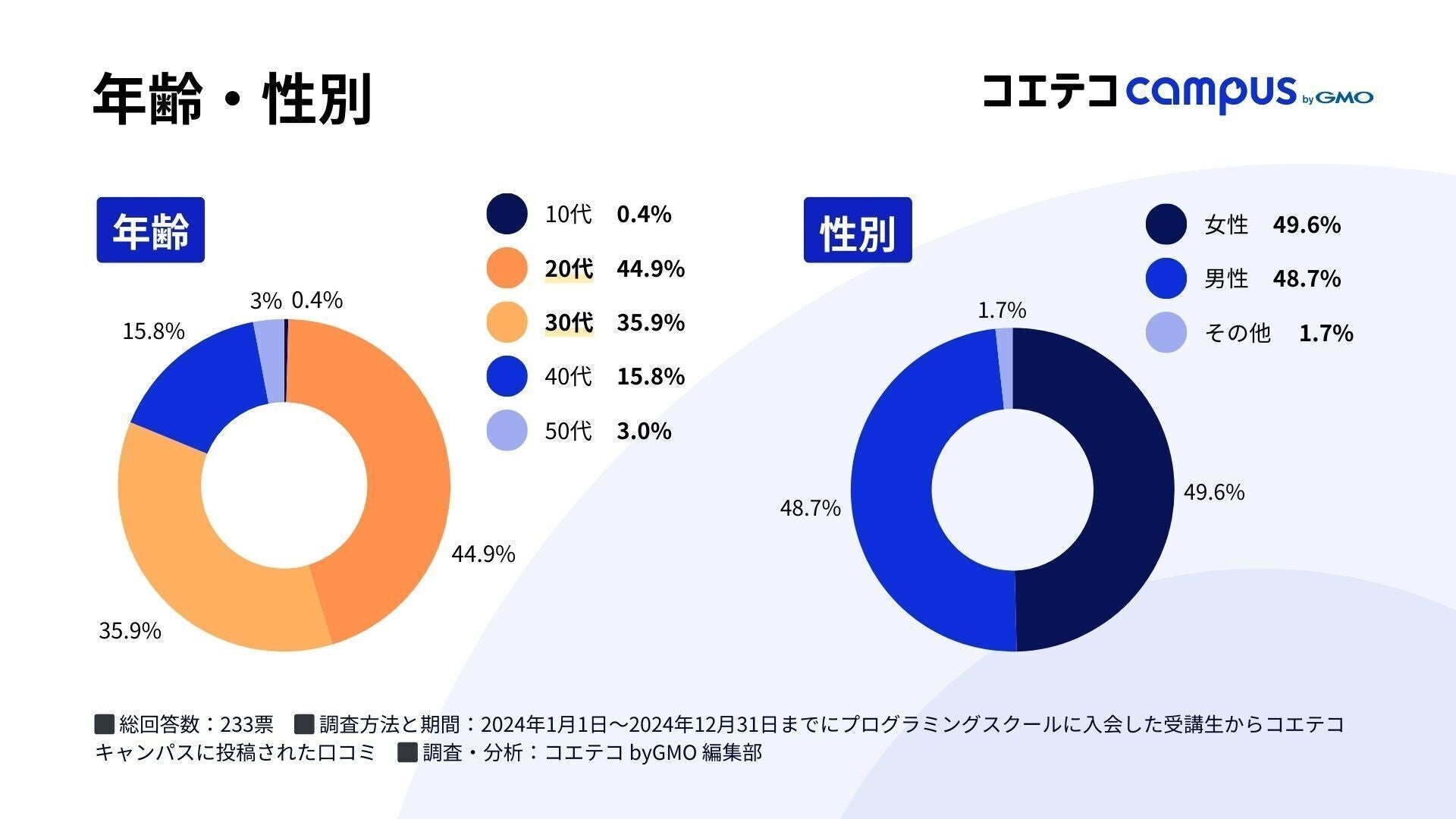 調査対象: 2024年1月1日(月)~2024年12月31日(火)にプログラミングスクールに入会した受講生から「コエテコキャンパス byGMO」に投稿された口コミ