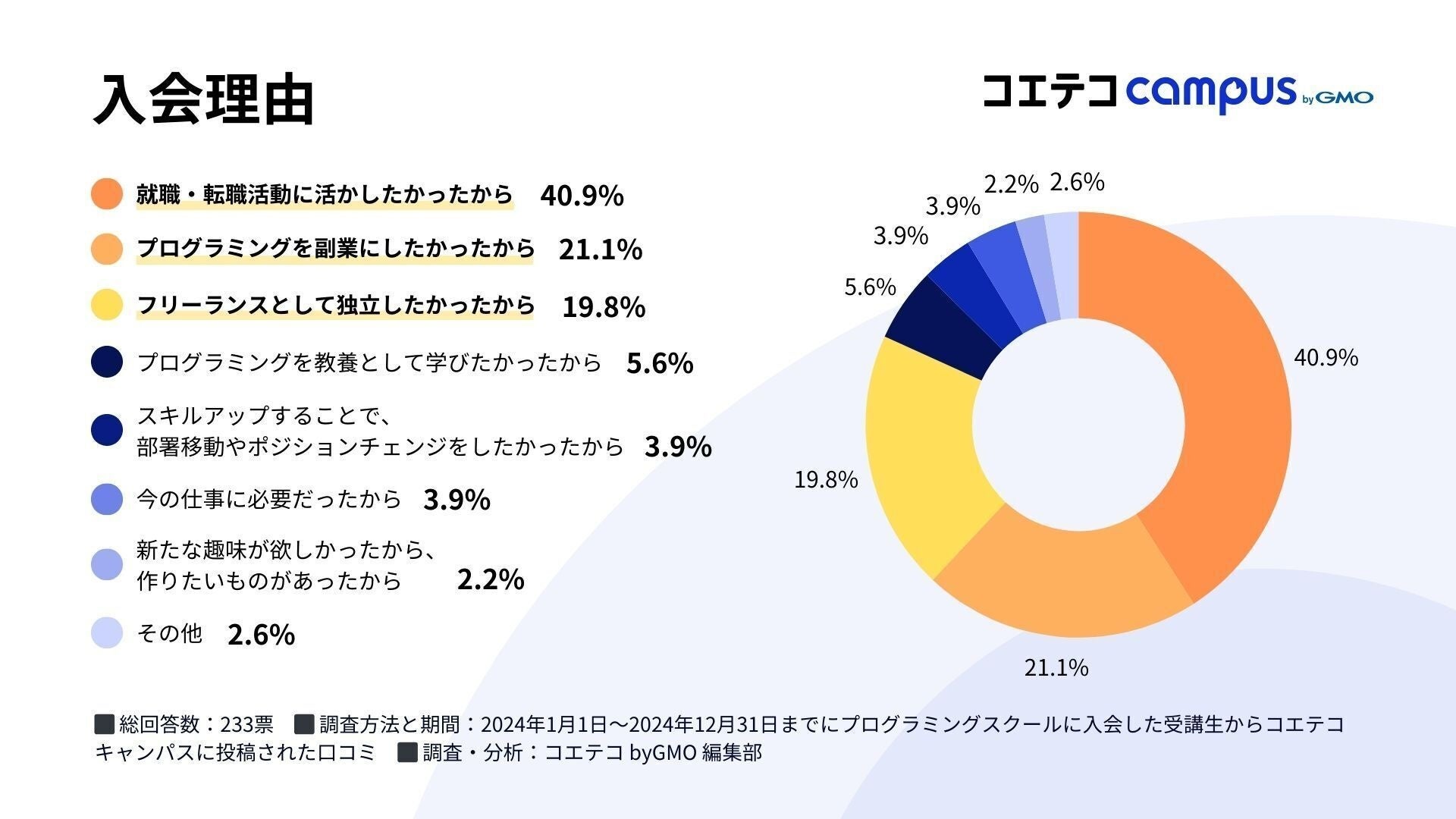 ・プログラミングスクール入会理由の最多は「就職・転職活動に活かしたかった」(40.9%)