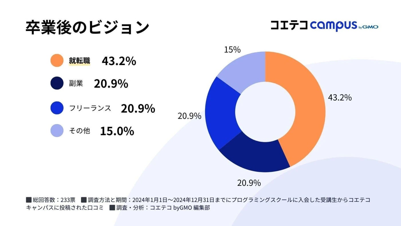 卒業後のビジョンでは「就職・転職」(43.2%)が最多となり、多くの受講者がプログラミングスキルを新しいキャリア形成の手段として活用していることがわかります。一方、「副業」(20.9%)や「フリーランス」(20.9%)の合計が40%超にのぼり、自由な働き方や柔軟なキャリアを目指す層の増加も見られます。