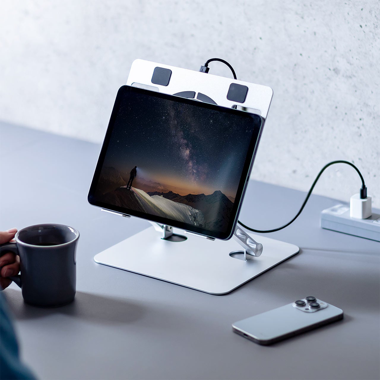 角度と高さを無段階調整可能な高性能スタンドを採用しており、