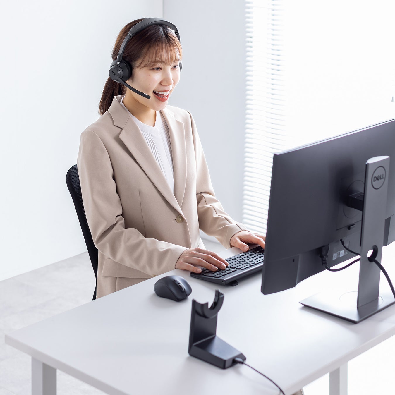 使い終わったらクレードルに置けるので、ヘッドセットがスマートに収納できます。クレードルに置けば自動的に充電が開始されるので、充電切れを防ぐことができ、また、充電クレードルがなくても充電が可能です。