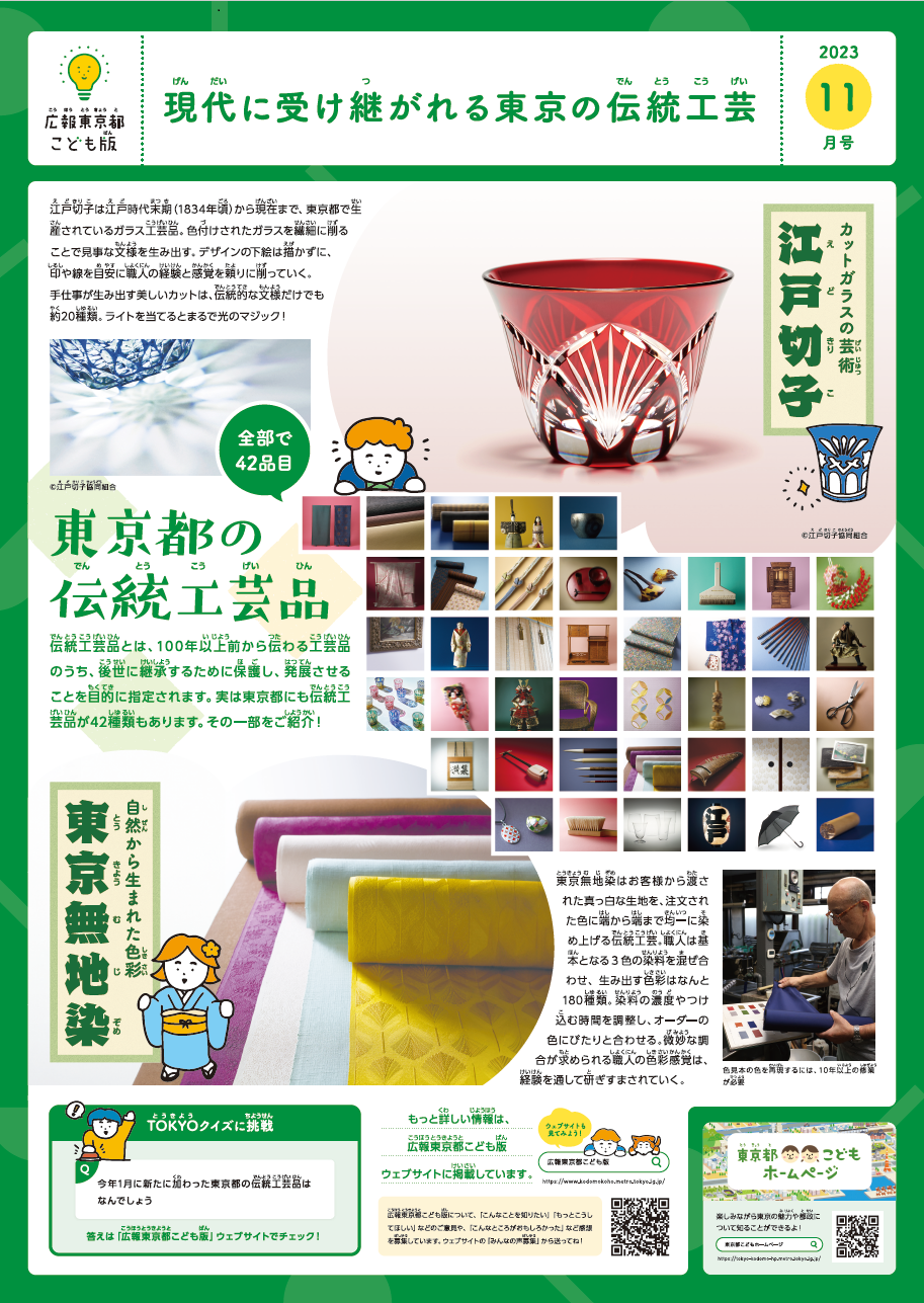 東京都は、こども達の東京に関する知識を深め、都政への理解を促進していく取り組みとして、毎月1回「広報東京都こども版」を配信しています。11月号の特集では、東京の伝統工芸品を紹介します。東京で長い歴史と伝統があり、伝統的な材料を使い、受け継がれてきた技術で作り上げる工芸品を東京都は「東京都伝統工芸品」として認定しています。2023年1月には「東京手彫り印章」が加わり、その数は42になりました。職人が一つひとつ、心を込めて丁寧な手仕事で生み出す伝統工芸品の世界をご紹介します。