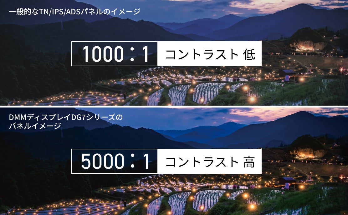 ※一般的なTN/IPS/ADSパネルのコントラスト比1000:1との比較をイメージした画像です。