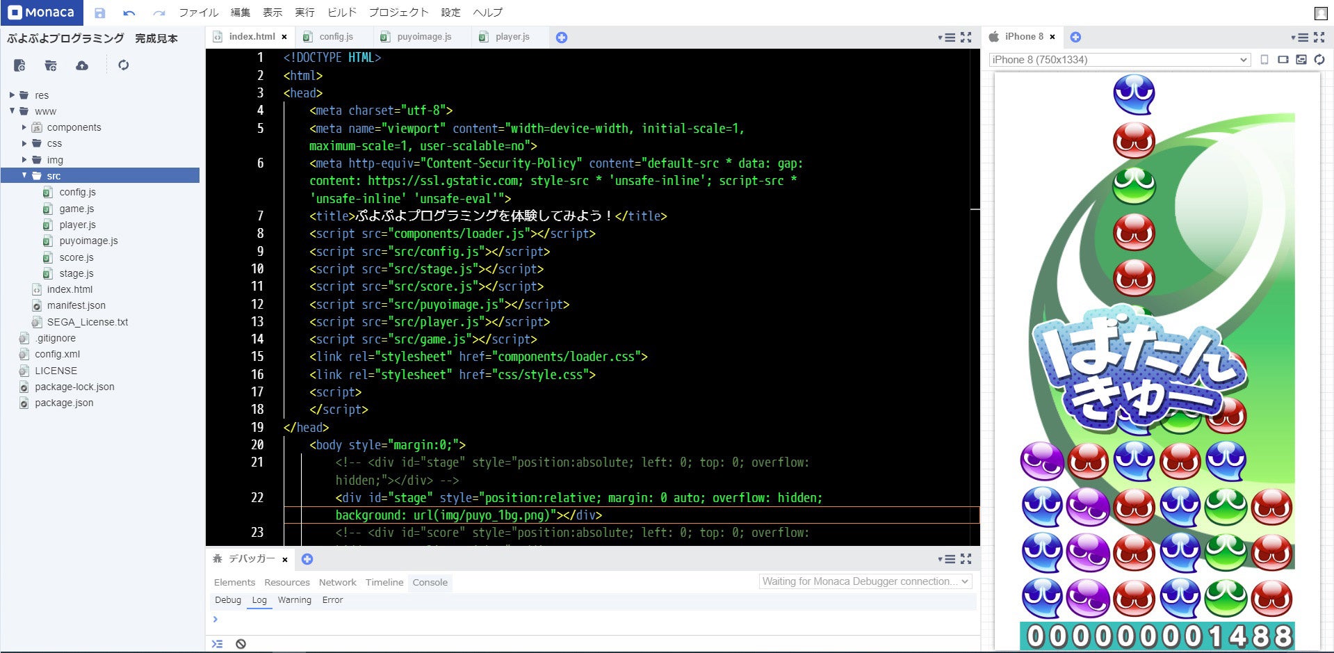 『ぷよぷよプログラミング』は、株式会社アシアルが提供するプログラミング学習環境『Monaca Education』において、「ぷよぷよ」のソースコードを書き写す作業(写経)を通して、プログラミング学習できる教材です。1,000以上の教育機関で利用されている『Monaca Education』は、クラウドサービスのため教育現場での導入や運用が簡単で、インターネット環境があれば既存PCやタブレットによる学習や指導が可能です。2020年6月の提供開始以来、登録者は116,000人を突破しています。セガではゲーム事業や「ぷよぷよ」のeスポーツ展開を通じて培ったノウハウや資産を活用し、小学校、中学校、高等学校、大学でのプログラミング教育を支援する取り組みを進めています。