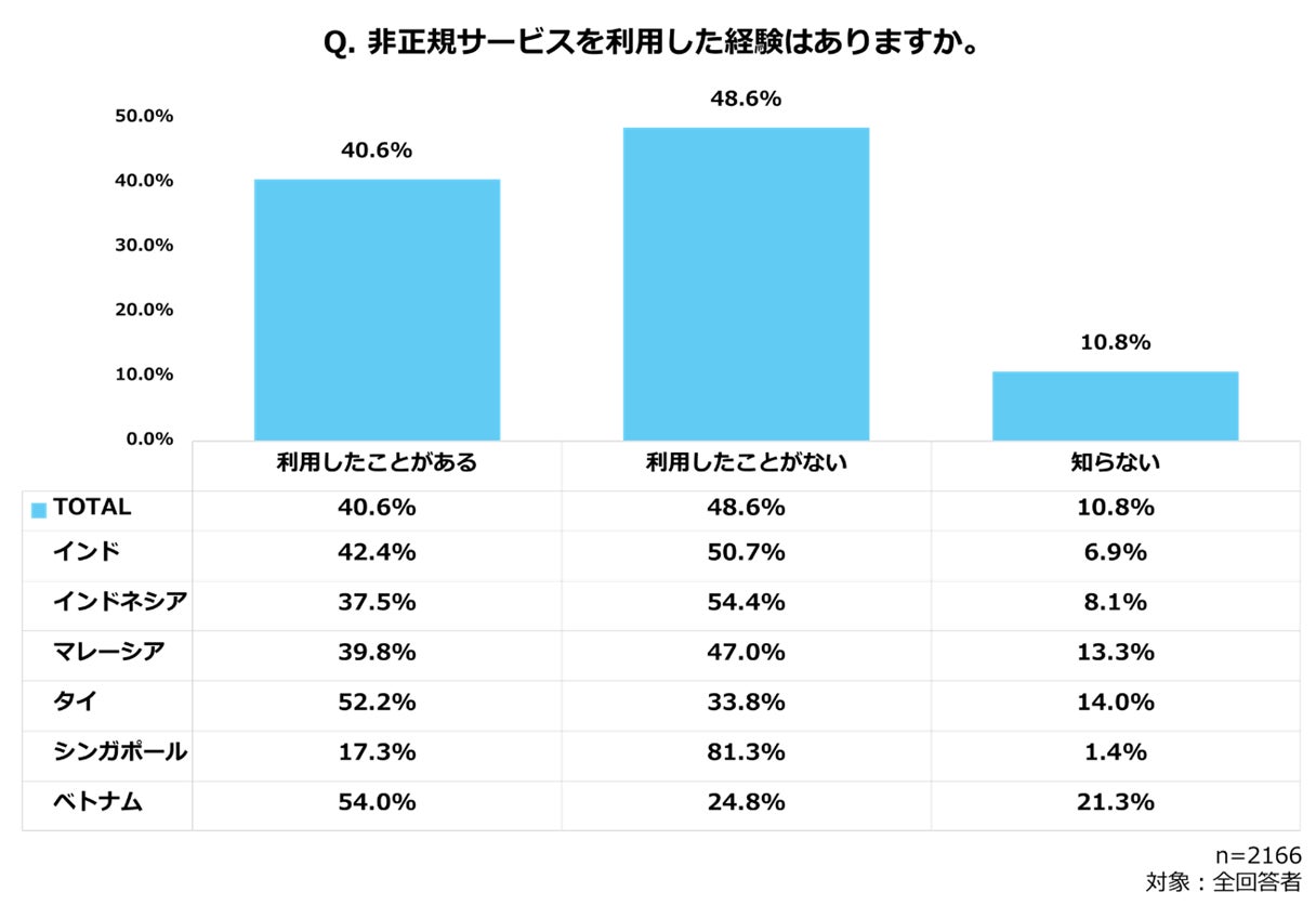 アニメ視聴プラットフォームについては、非正規サービスを利用したことがない(48.6%)が利用したことがある(40.6%)を全体として上回る結果となりました。国別で見るとベトナム、タイでは依然として非正規サービス利用経験者が優勢です。