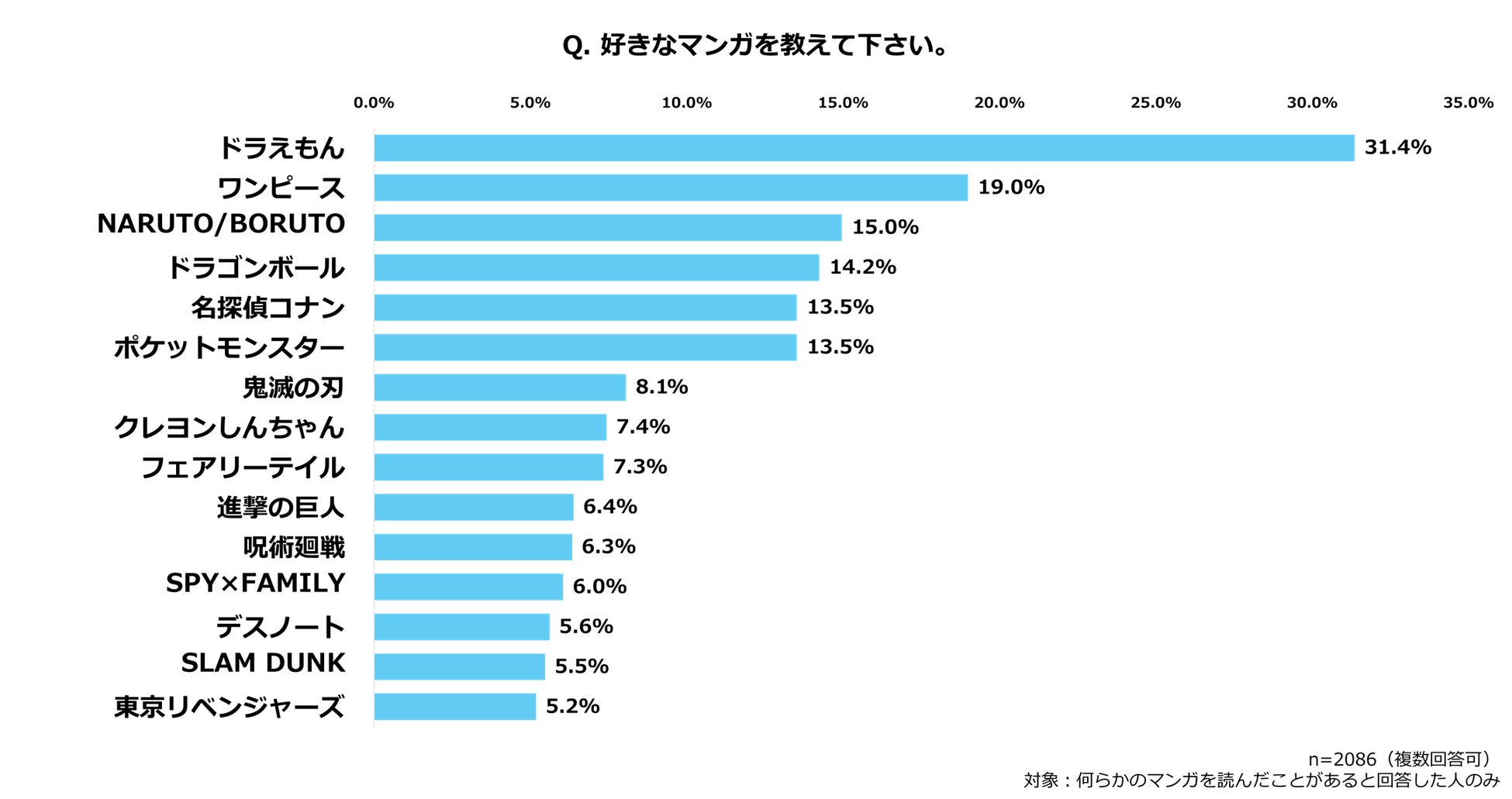 ・人気マンガは上位から、『ドラえもん』(31.4%)、『ワンピース』(19.0%)、『NARUTO/BORUTO』(15.0%)の順となり、10年以上継続している作品群が上位を占める。