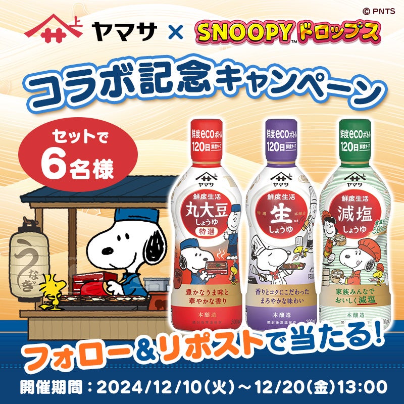 公式X(旧:Twitter)、『スヌーピードロップス』と『ヤマサ醤油公式』の、両方のアカウントをフォローして、12月10日に投稿されるキャンペーン投稿をリポストした方の中から抽選で6名様にプレゼントが当たります!